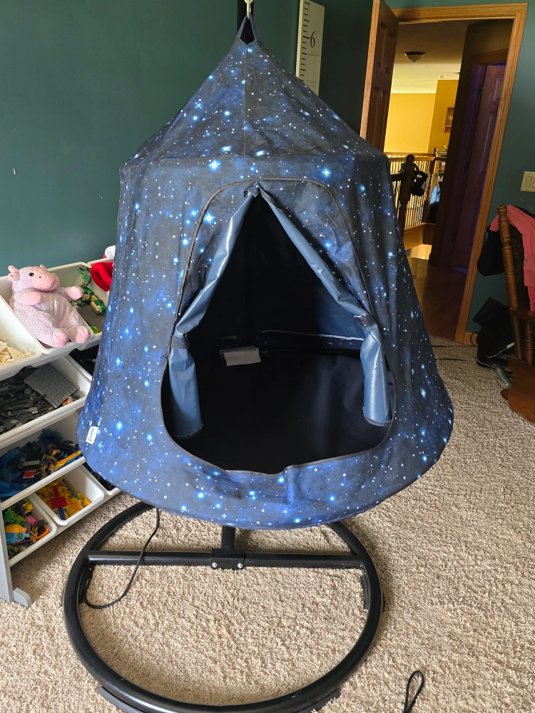 This is a hanging pod swing seat for kids. It features a fun blue star pattern. It's in great condition and ready for a new home! 300# weight capacity