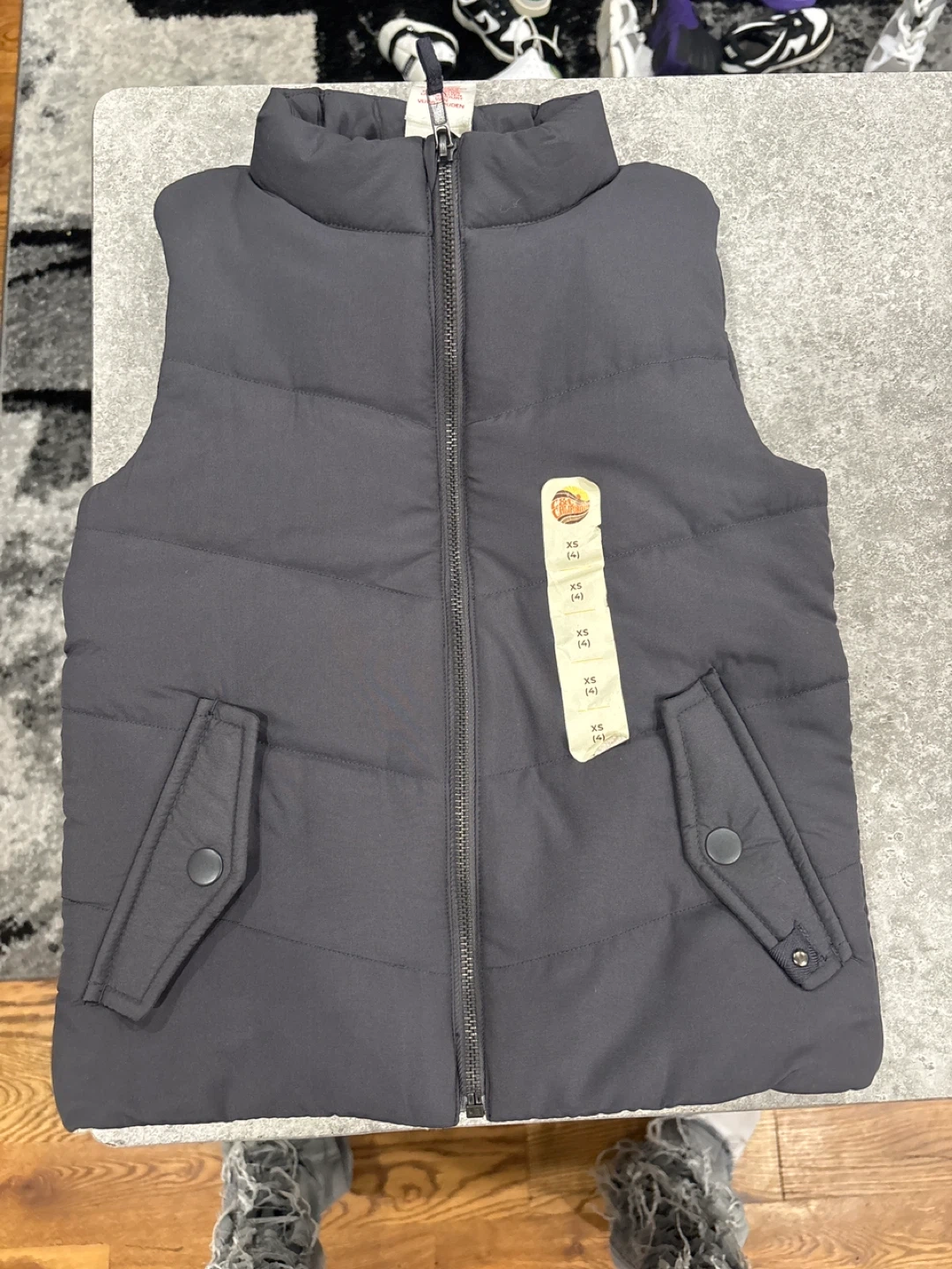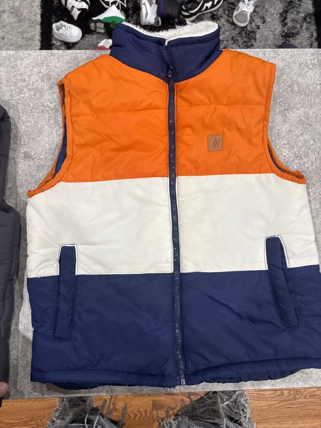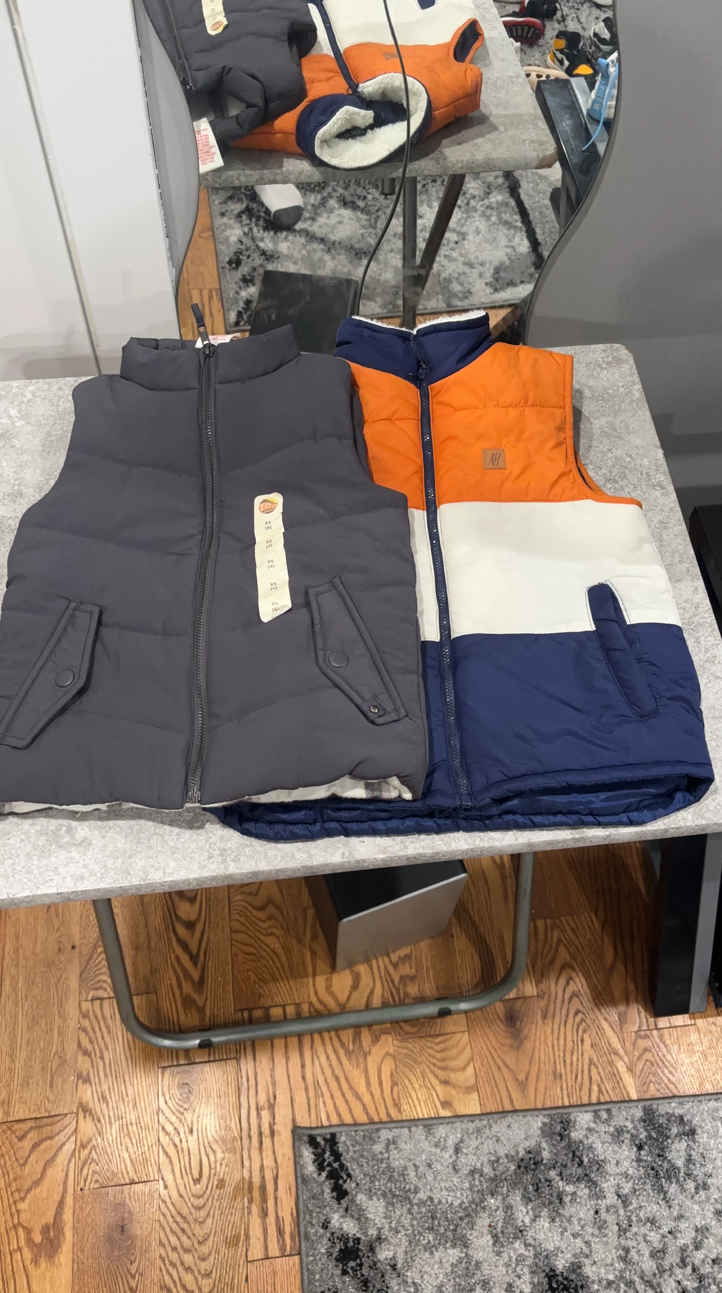 71Here's a bundle of two gently used puffer vests for kids! One is a color block design in orange, white, and navy, and the other is solid gray. Both are in size XS (4) and ready for a new home