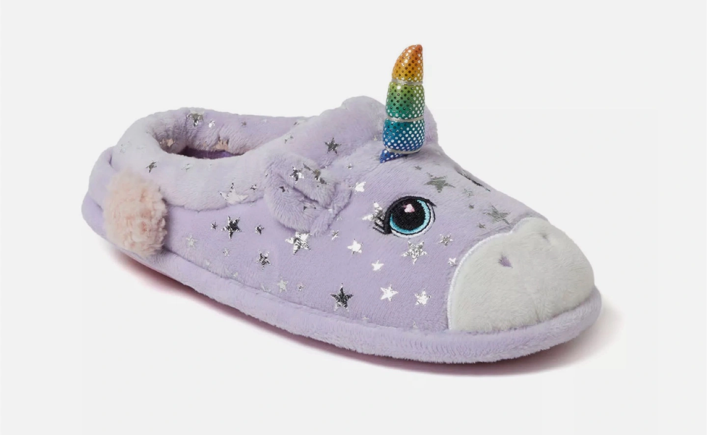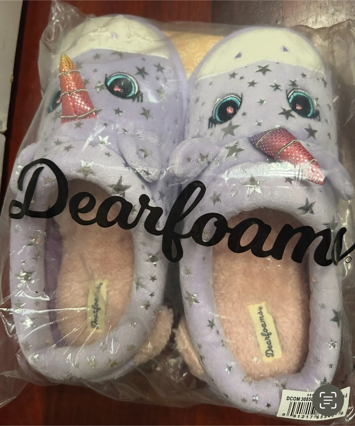 BRAND NEW Kids Purple Dearfoams Plush Unicorn Memory Foam Slippers - size 4/5 - hard sole. They’re multi-colored and for unicorn lovers.