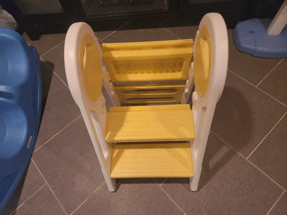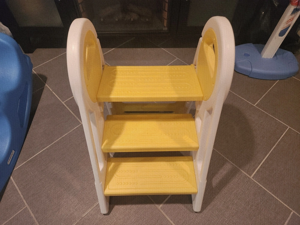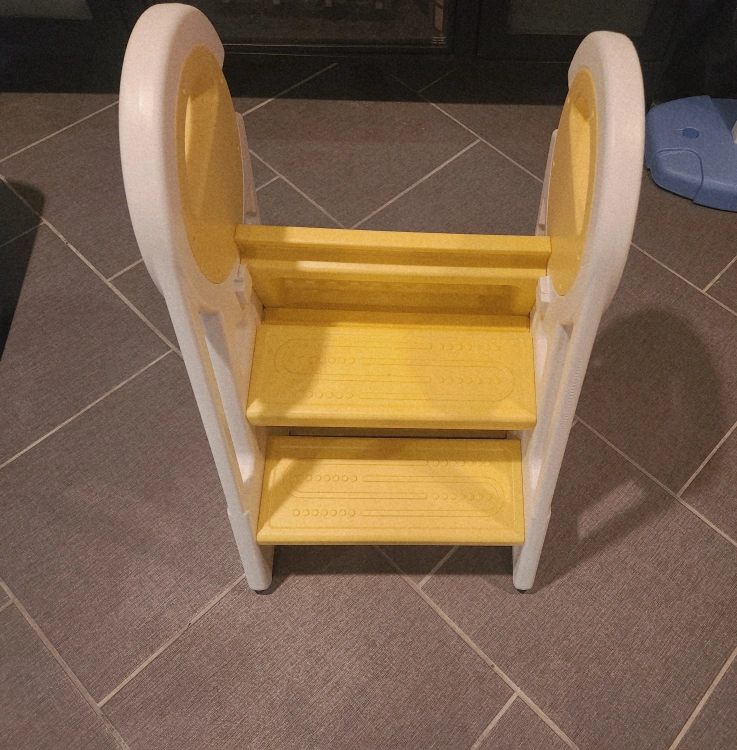 Selling a kids step stool in very good condition! It's a sturdy and safe way for your little one to reach higher places. The stool is a cheerful yellow and white color. Had it for 2 yrs. Ages 2-5