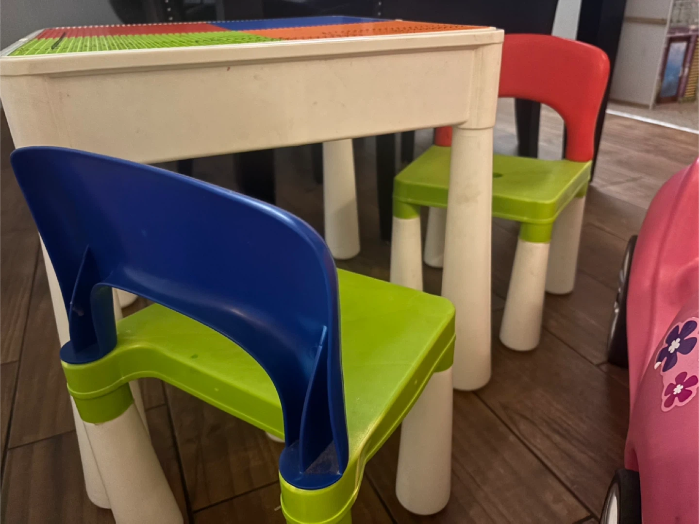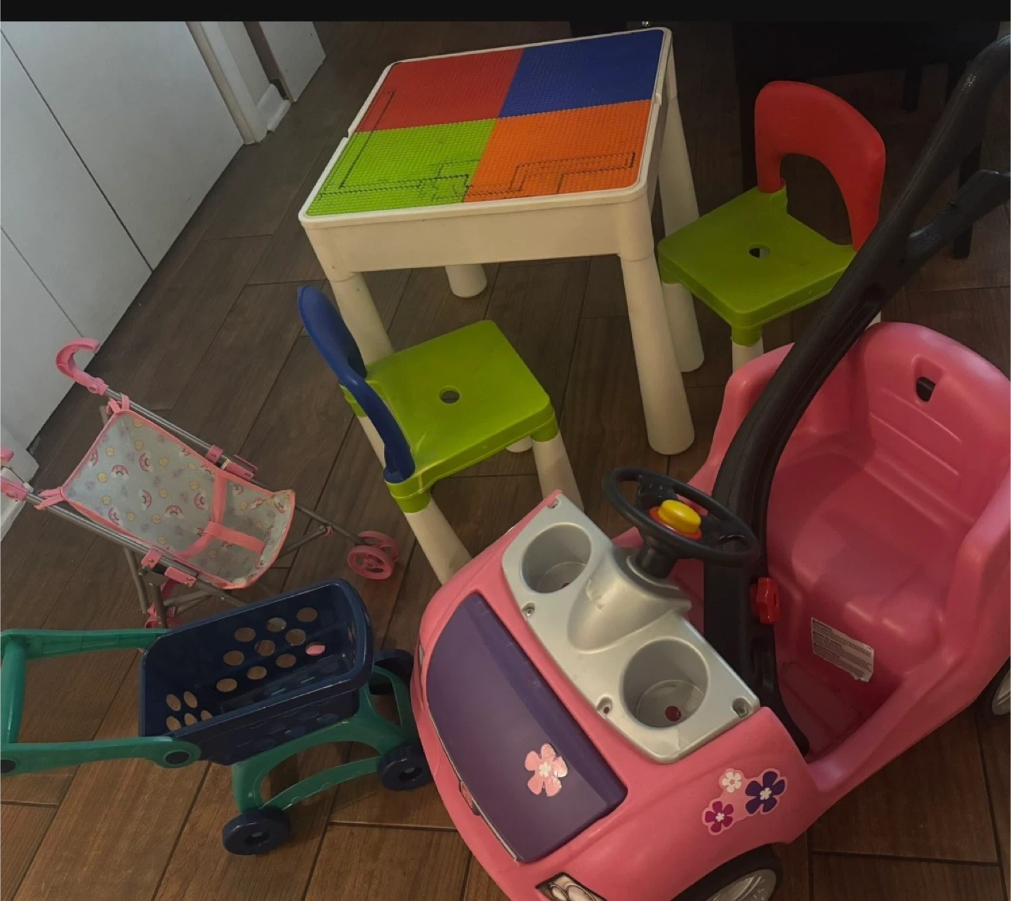 15Selling a set of kids' toys! Included are a Step2 ride-on car, a table with four colorful sections, two chairs (one red, one green), a doll stroller with a cute patterned fabric, and a shopping cart. Great for hours of fun and imaginative play!