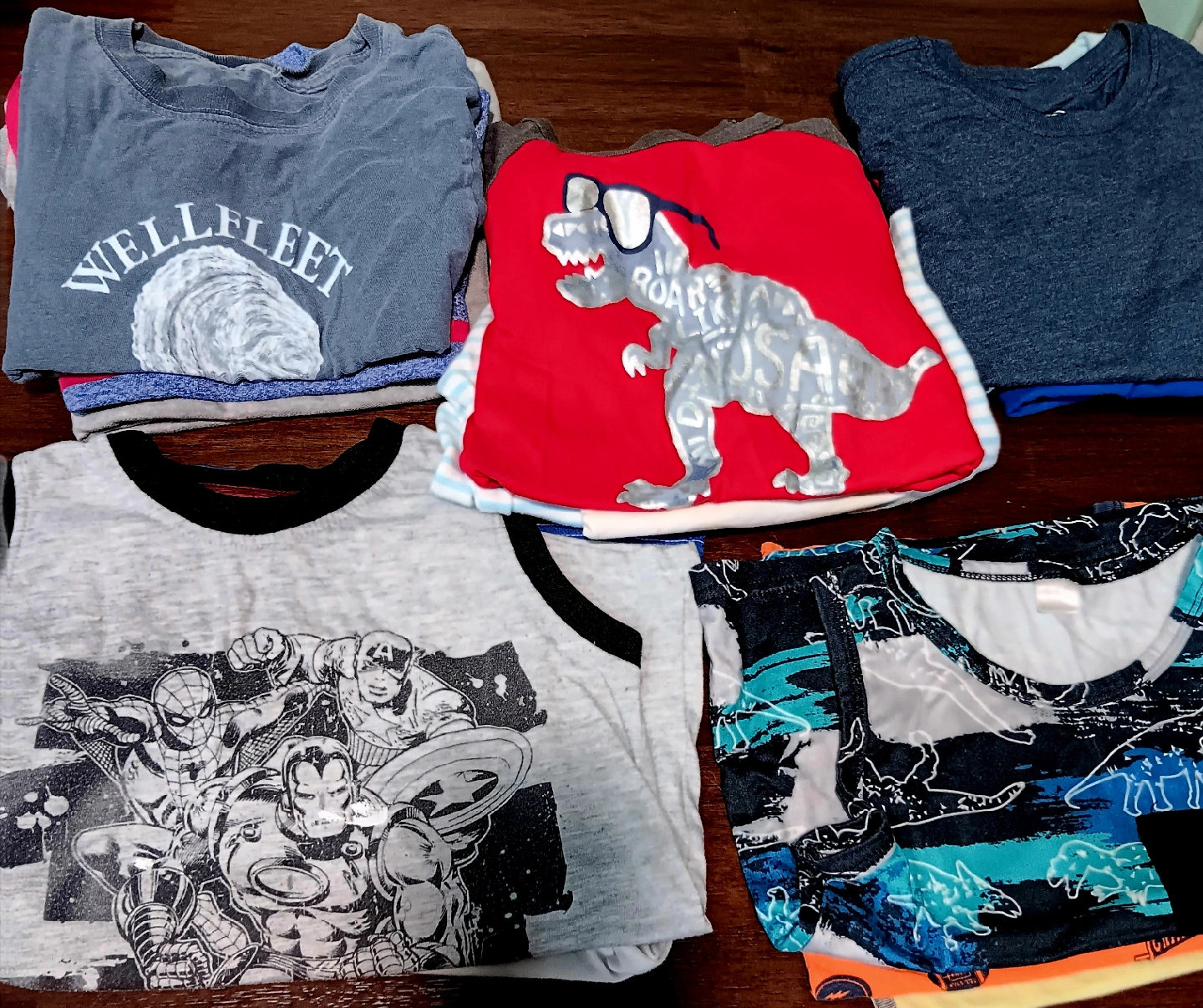 Selling a bundle of kids' t-shirts with fun designs! There's a variety of colors and styles, including a cool dinosaur tee and a superhero one with Spider-Man, Captain America, and Iron Man