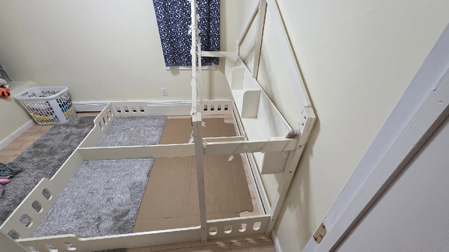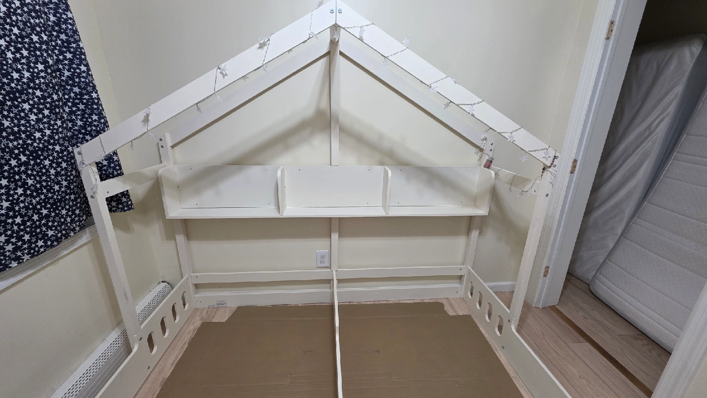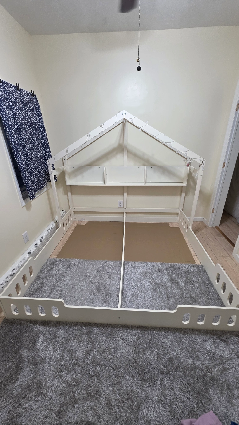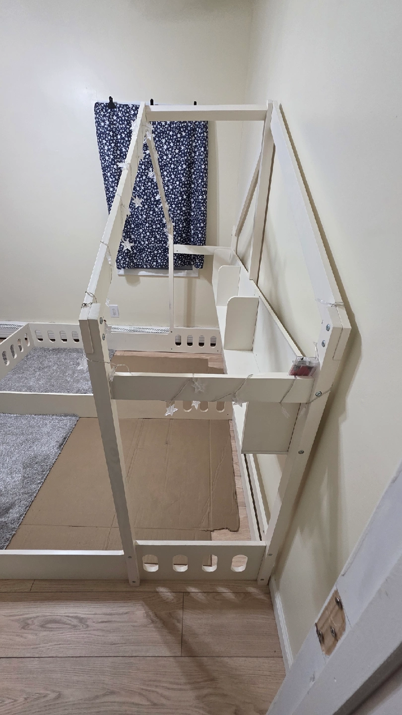 Selling a cute white house bed frame for kids. It's in great condition and ready for a new home! The frame has a charming house design that will make bedtime fun. Perfect for creating a cozy and imaginative space for your little one