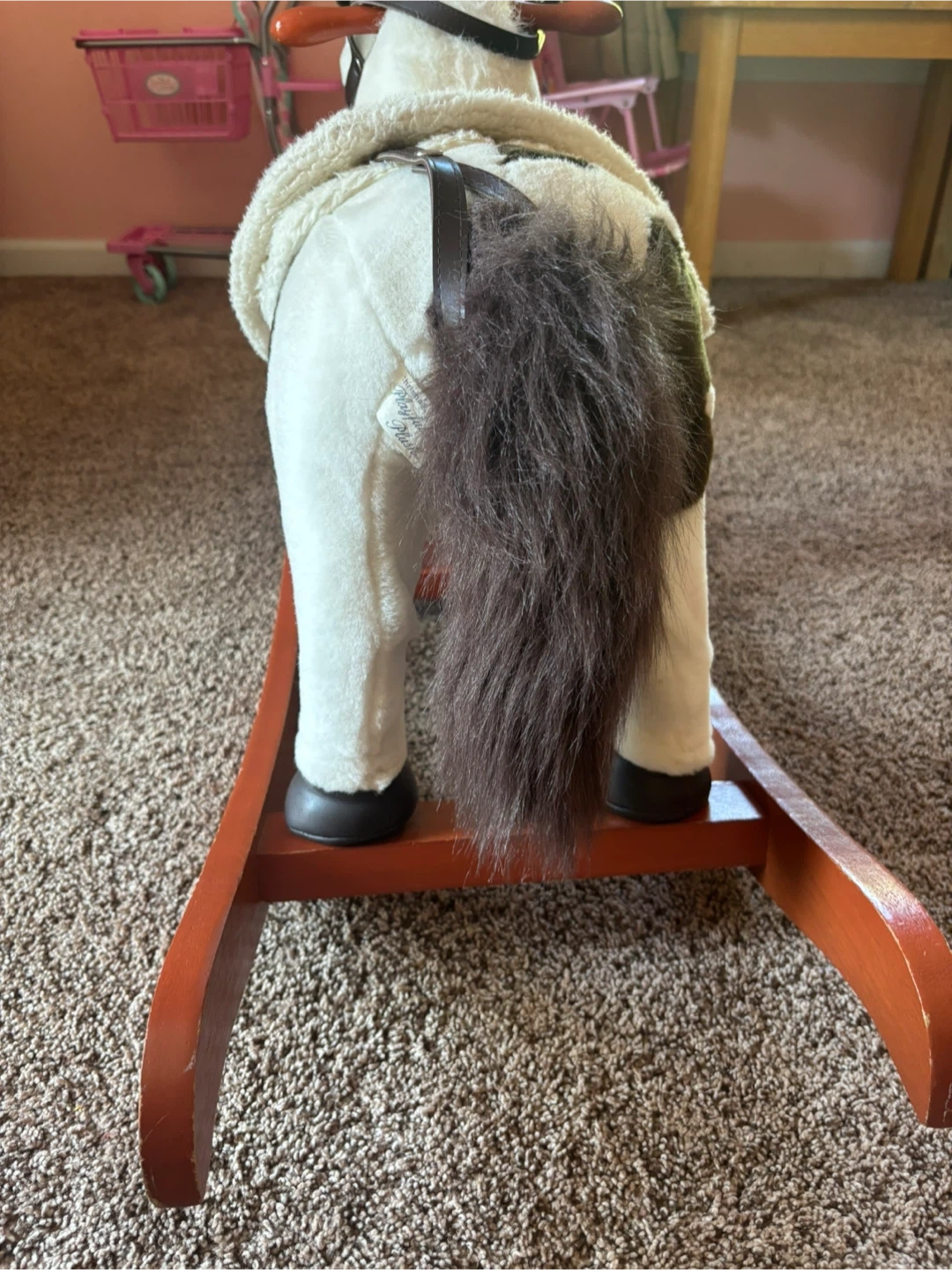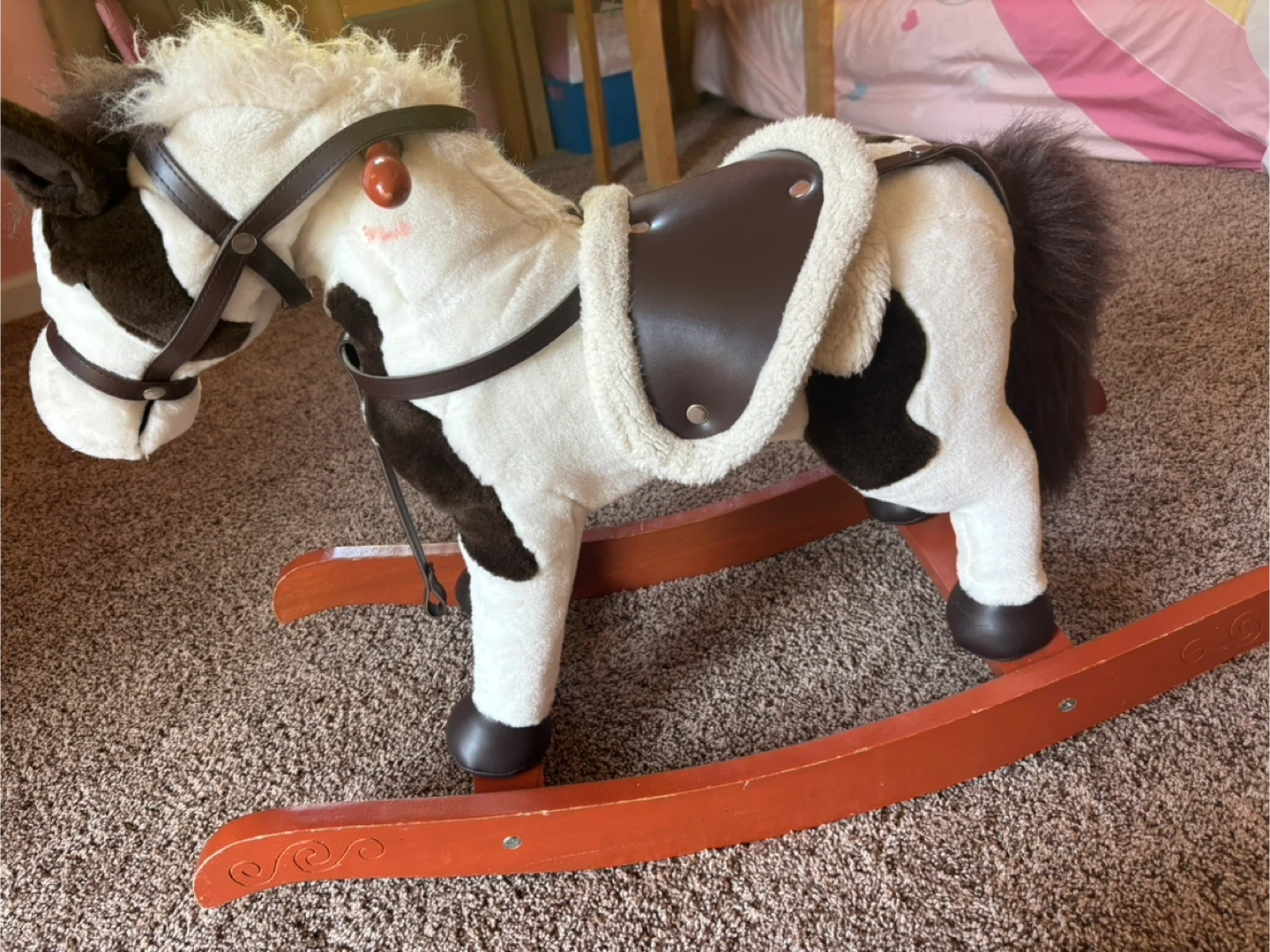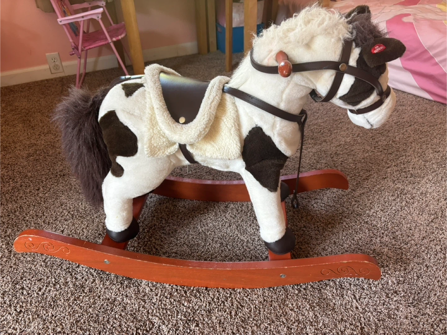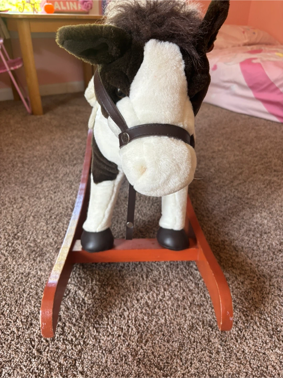 Wood Rocking Horse for kids. It’s like new only used a few times. The material from the horse has stains (washable markers) can be washed.