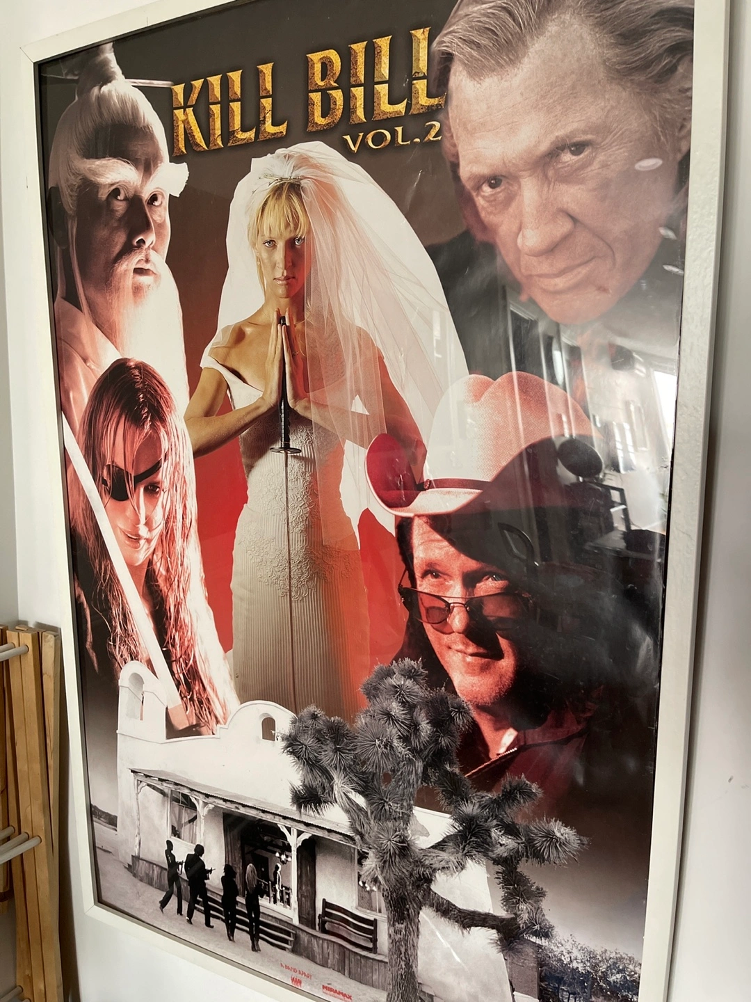70Framed movie poster. Kill Bill Vol. 2. Miramax Films. White frame shows minor wear. Some water damage on poster. $400 poster