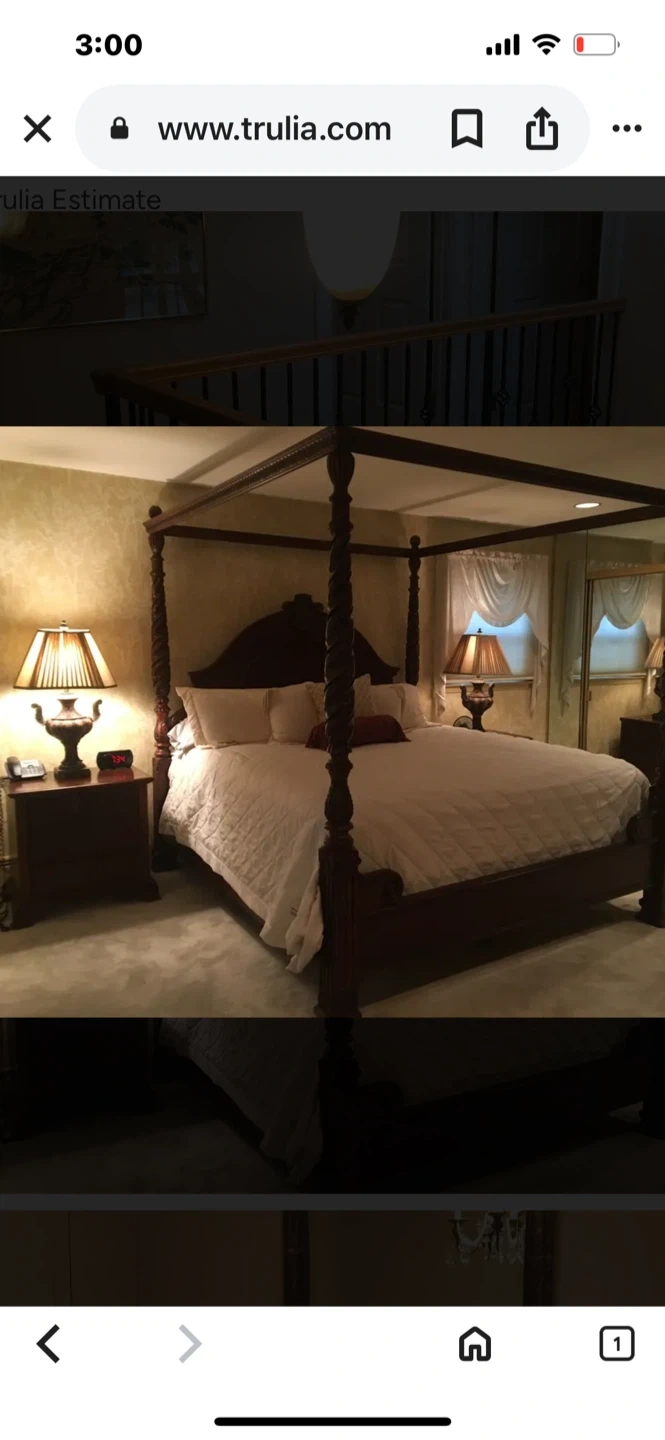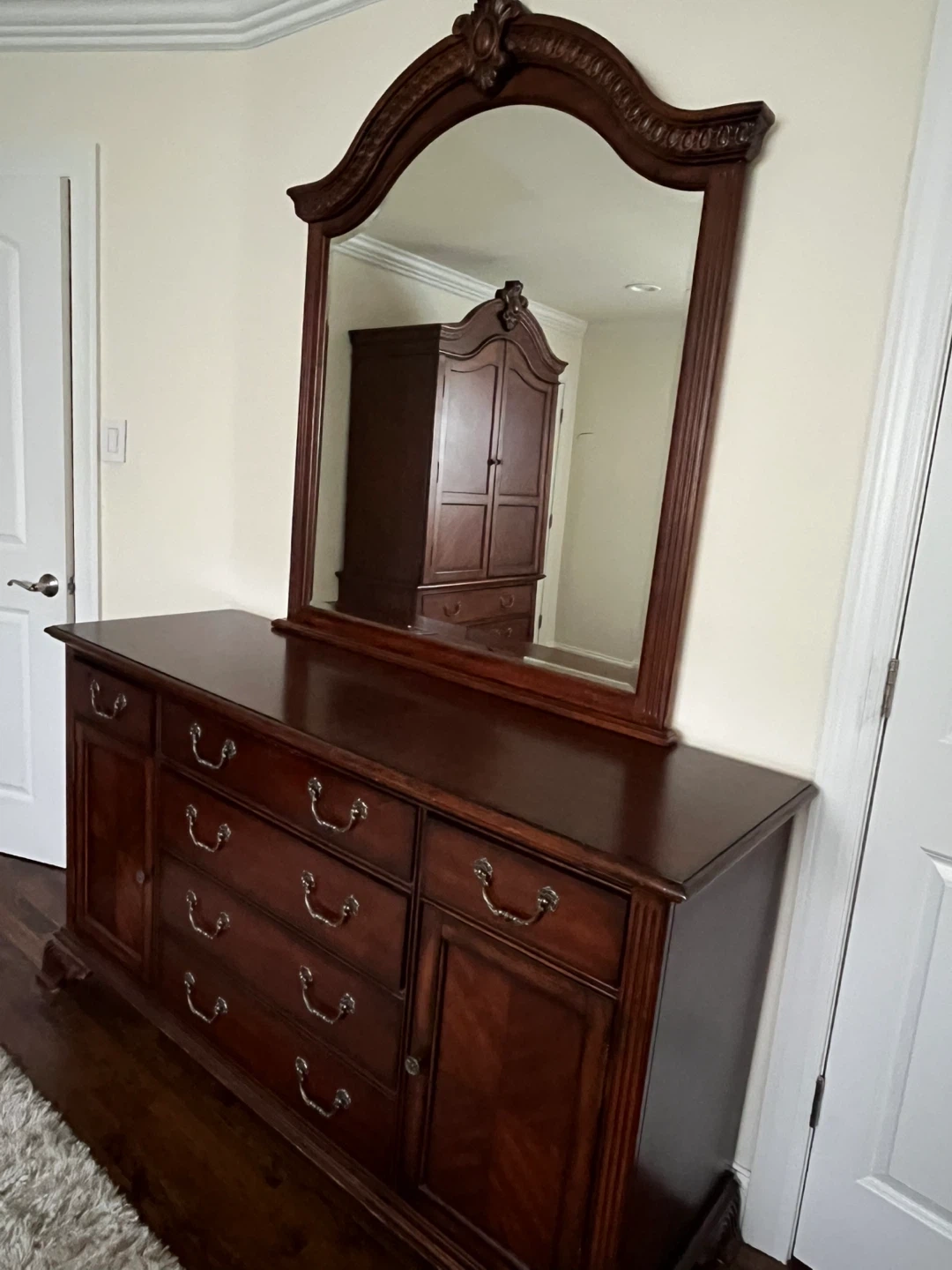 King size 4 poster bed frame with armoire is 2 pieces one on top of other, dresser with mirror & 2 nightstands. Elegant, romantic King size wood canopy bedroom set