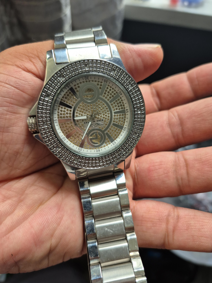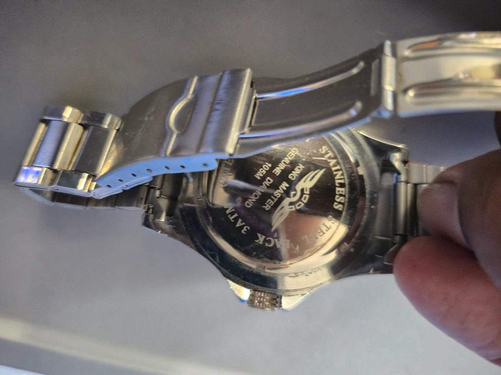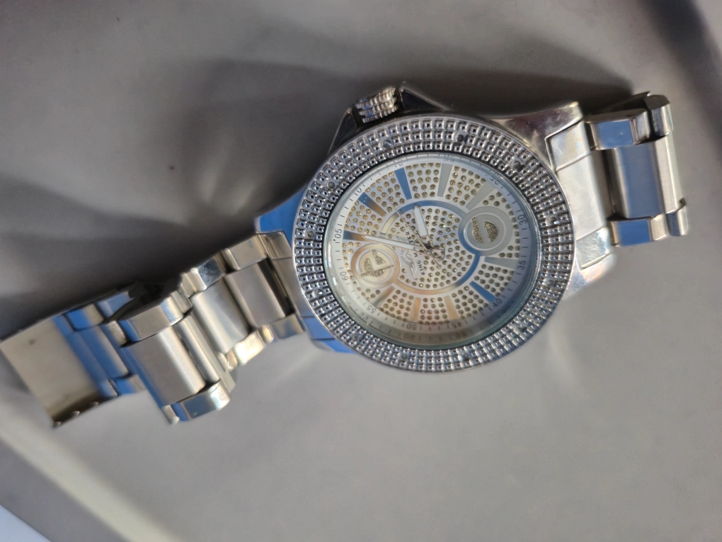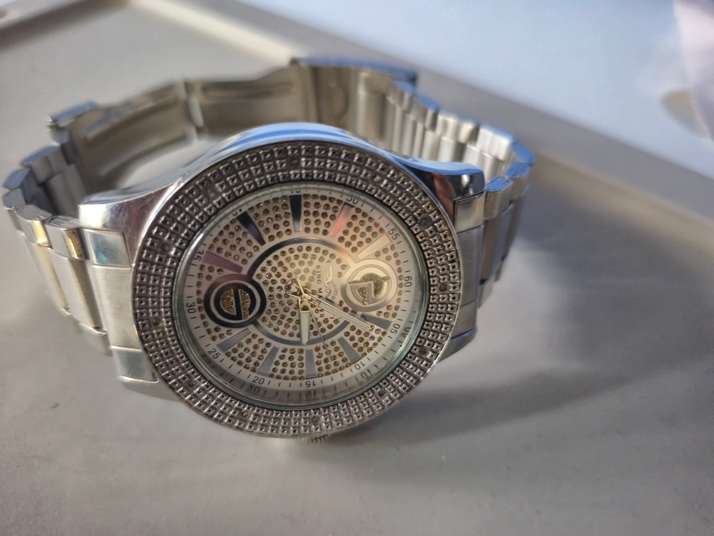 Selling a King Master stainless steel watch. It has a silver-tone finish and a decorative design on the face. The watch features a stainless steel band and a water resistance of 3 ATM. p.s shows some signs of wear and tear but in all its in great condition