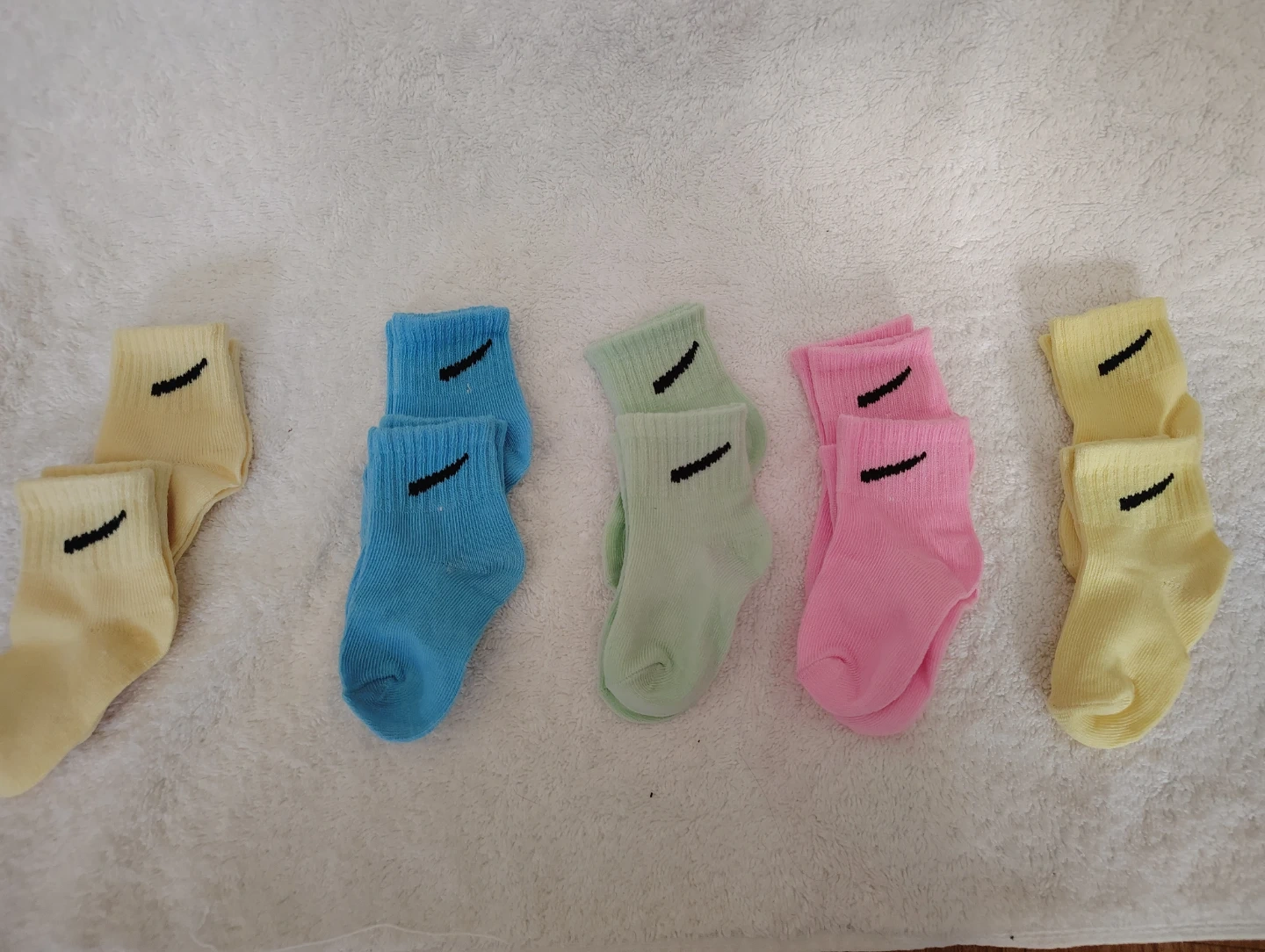I have a cute blue "King" outfit, perfect for a little one! It includes a long-sleeved shirt and pants. Also included are some adorable Nike baby socks in various colors!