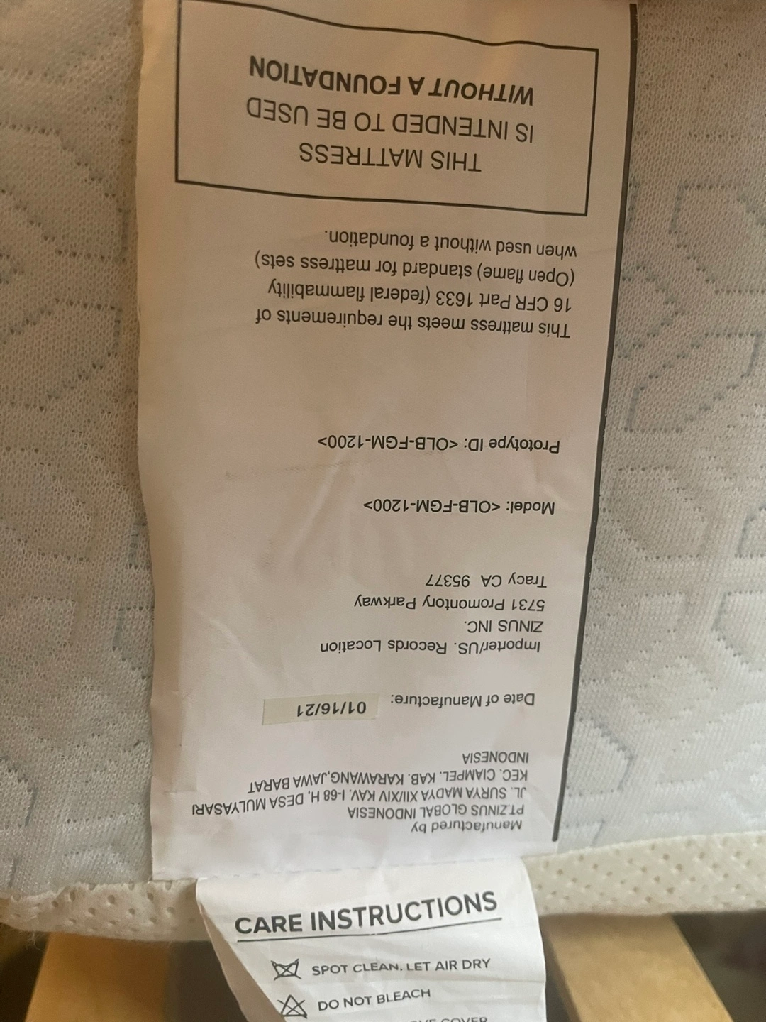 20Selling a king size bed and Zinus mattress, model OLB-FGM-1200. It measures approximately 80 inches by 76 inches with a thickness of 12 inches, as shown in the pictures. This mattress is intended to be used without a foundation.