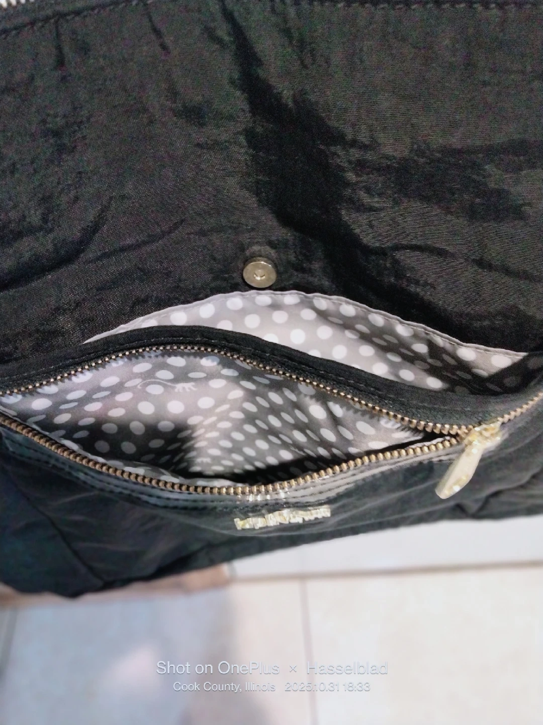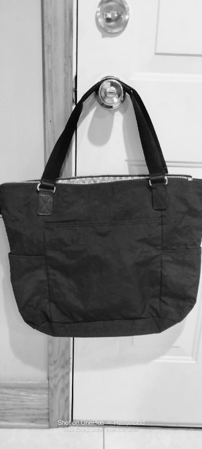 15Classic durable nylon tote for everyday use. The bag features a zipper multiple pockets. clean inside and outside hasn't been used.14" by 18"