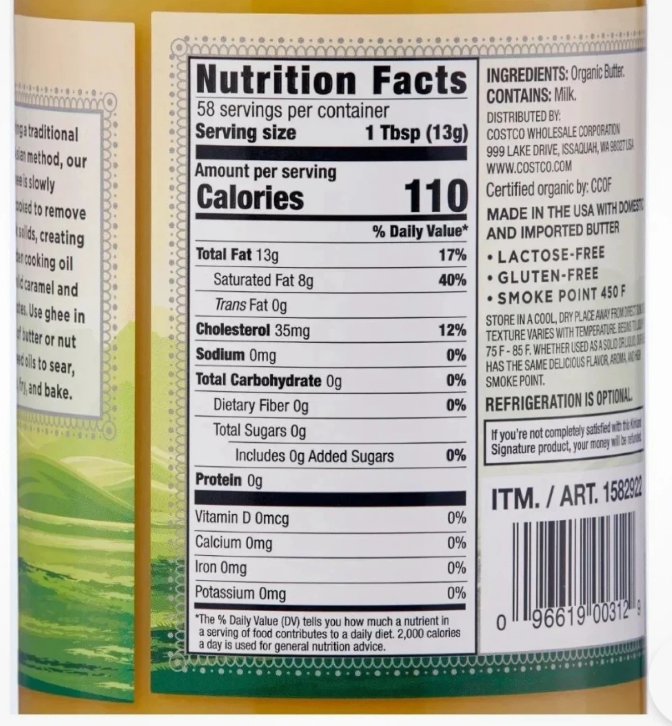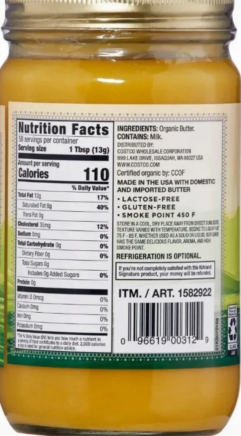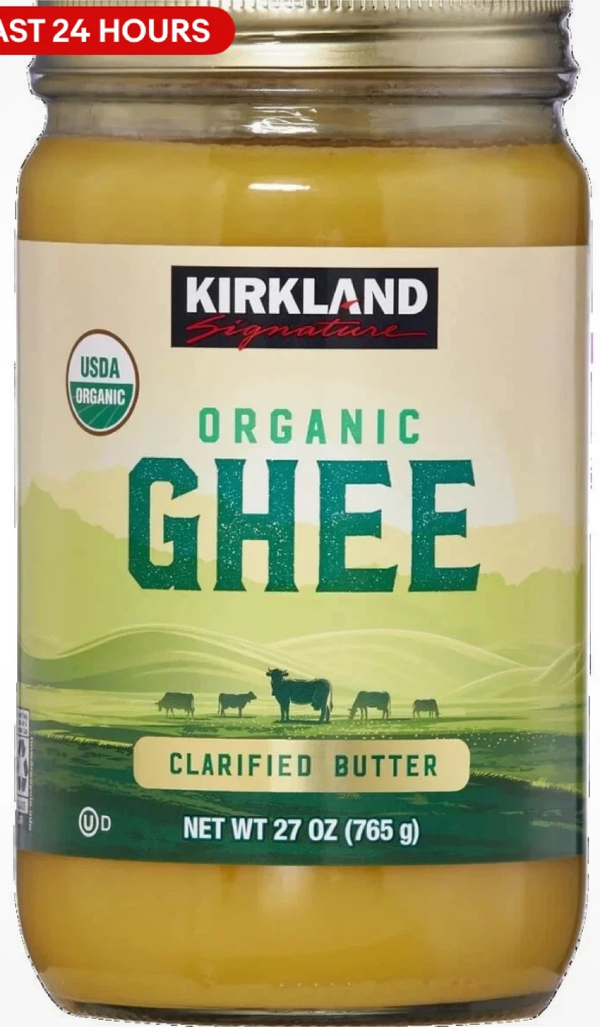 Selling a jar of Kirkland Signature Organic Ghee Clarified Butter. It's a 27 oz (765 g) jar of clarified butter made with organic butter. It's lactose-free and gluten-free, with a smoke point of 450°F. Perfect for cooking and baking!