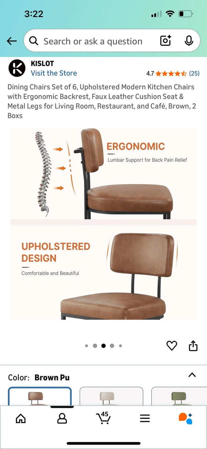 KISLOT dining chairs feature a stylish metal frame, perfect for modern dining rooms. The clean lines and minimalist design blend seamlessly with contemporary decor. Designed for both style and relaxation, these upholstered dining chairs feature premium faux leather that's soft to the touch yet durable. The thick cushioning provides all-day comfort. Built with a sturdy metal base, these dining chairs support up to 300 lbs, ensuring stability for daily use. These modern dining chairs measure 18.5"x22.2"x31.7", perfectly sized for any space. This dining chair also comes with a handle at the back, making it easy to move. The faux leather wipes clean easily with a damp cloth. Color: Brown Material: Faux leather Brand: KISLOT
