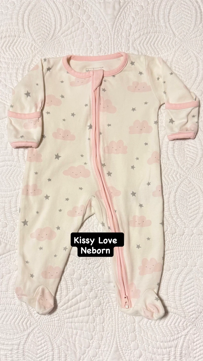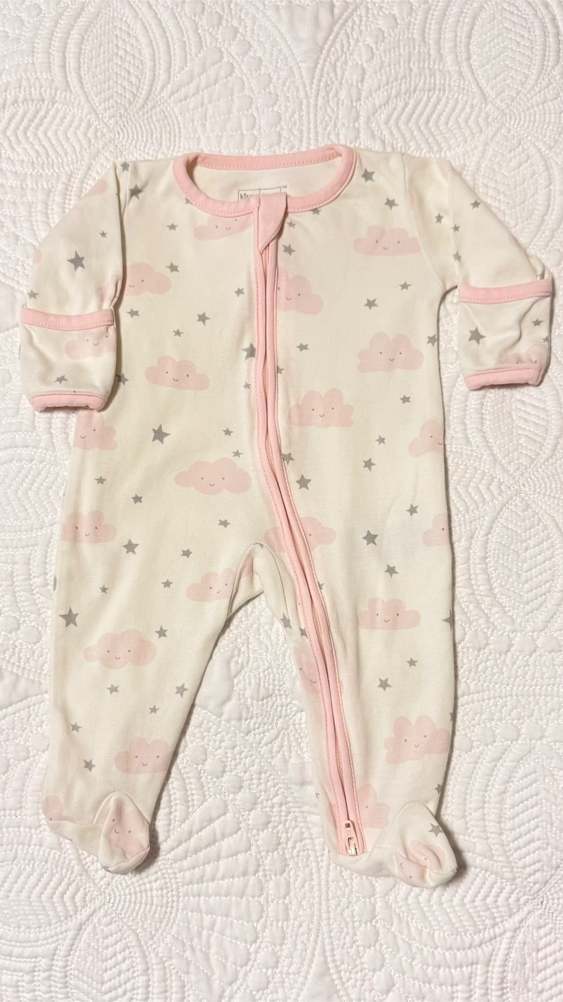 Here is a cute Kissy Kissy newborn footed pajama! It features a cloud and star pattern with pink trim and a zipper closure. Perfect for your little one! These are super soft, organic cotton pajamas! Super good quality and in excellent condition.