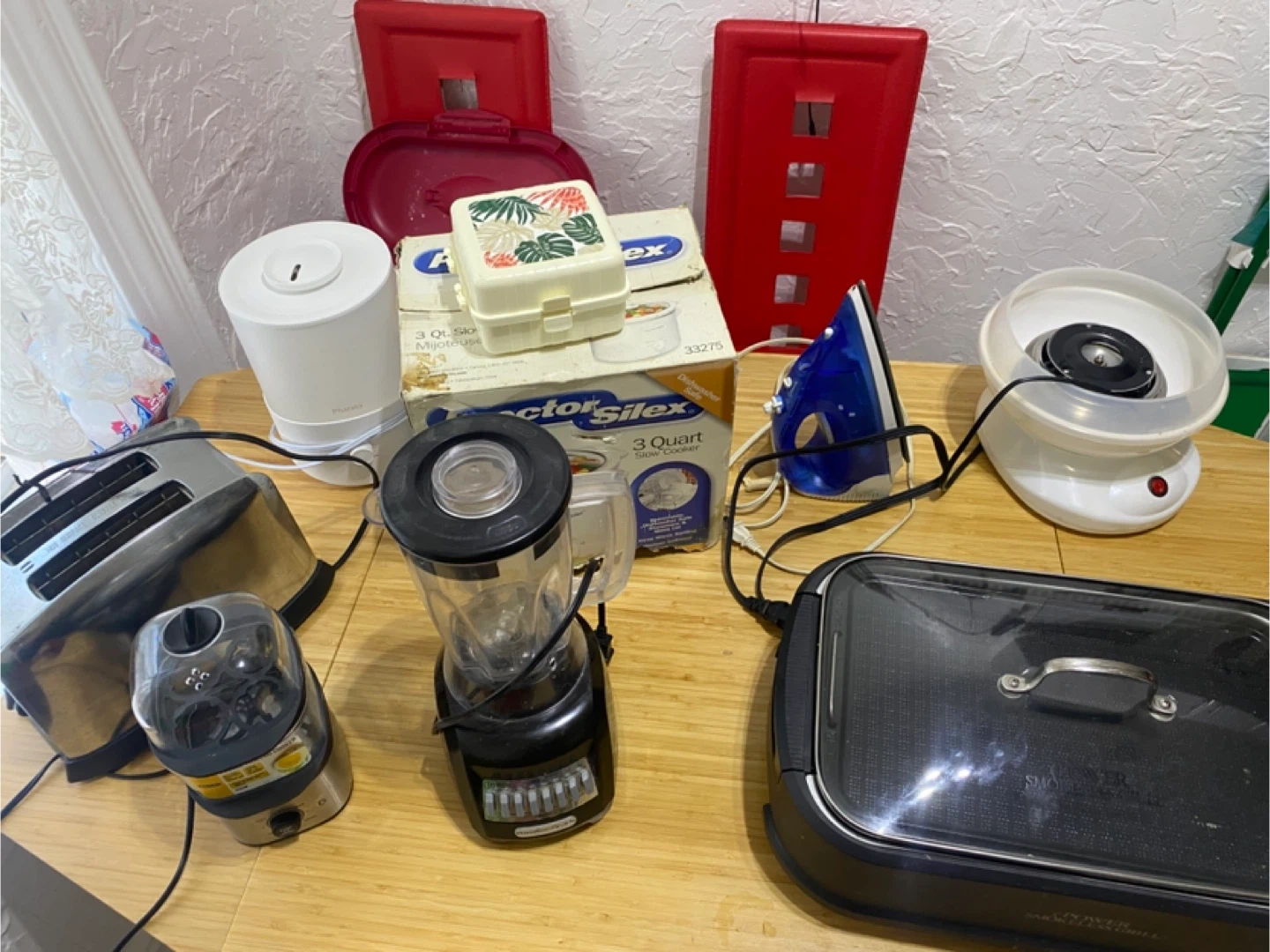 21Power smokeless grill 50$ Hamilton beach blender 15$ Bella do double tier egg cooker 10$ Cotton candy machine 20$ Iron 5$ Slow cooker 30$ Pharata air purifier 25$ Hamilton Beach toaster 15$ Everything is new rarely used it’s just dirty for being stored too long