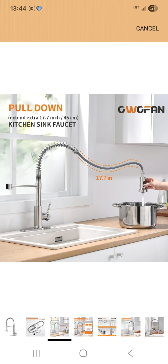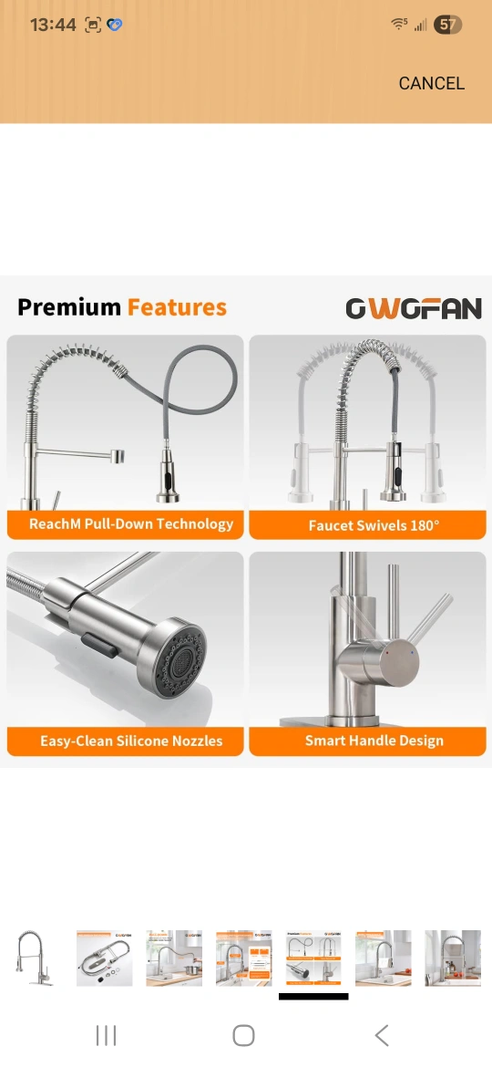 This is a GWOFAN kitchen faucet with a pull-down sprayer. It features ReachM Pull-Down Technology and easy-clean silicone nozzles. The faucet swivels 180 degrees and has a smart handle design. It extends 17.7 inches / 45 cm and is made of brushed nickel stainless steel.