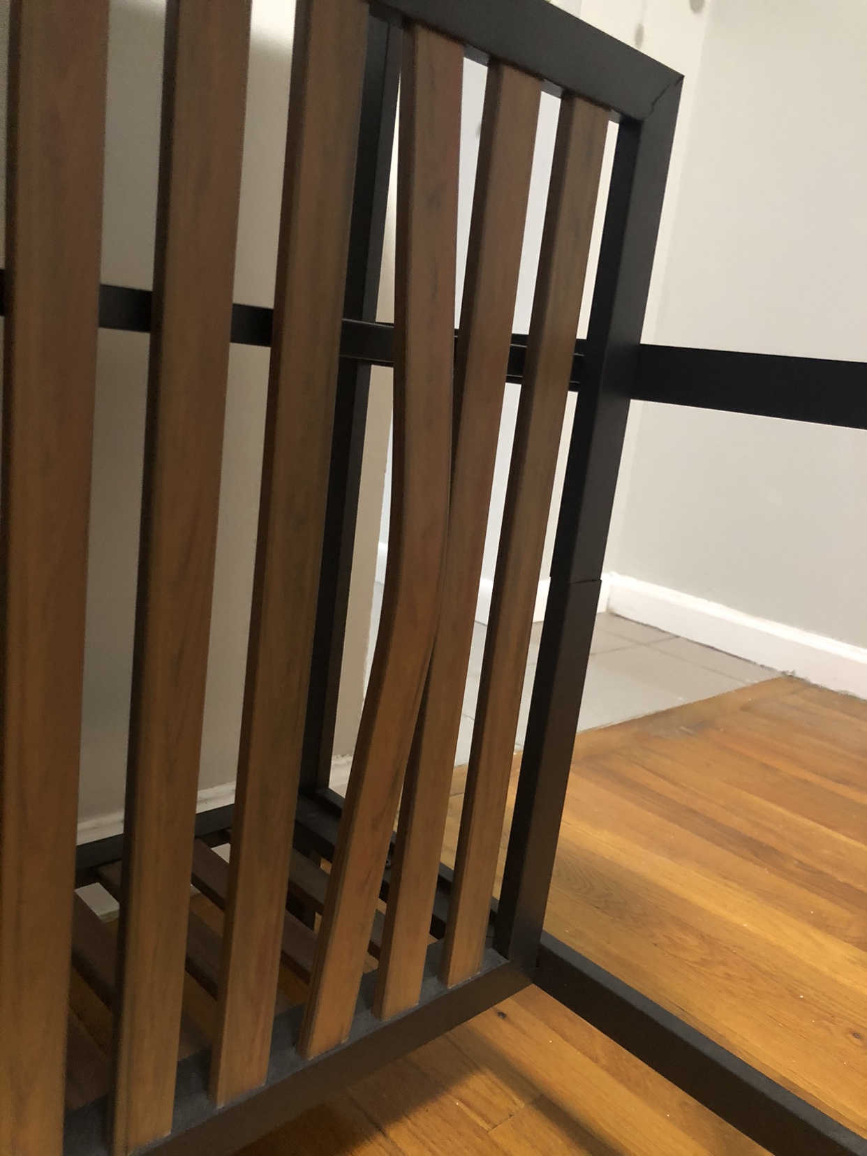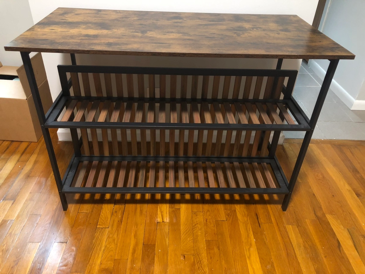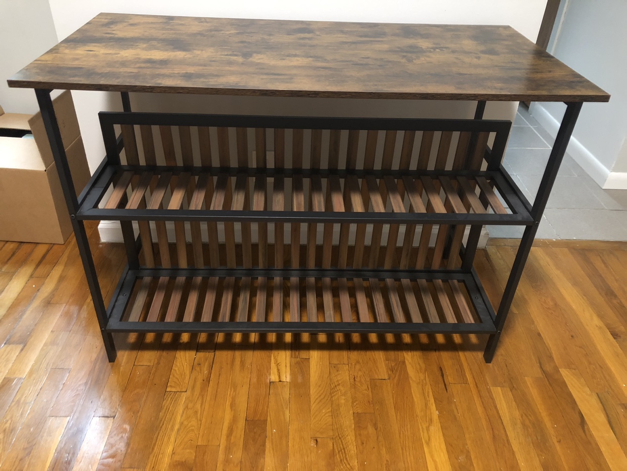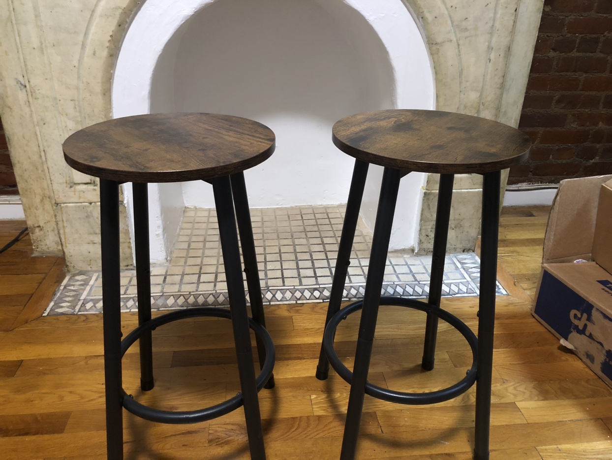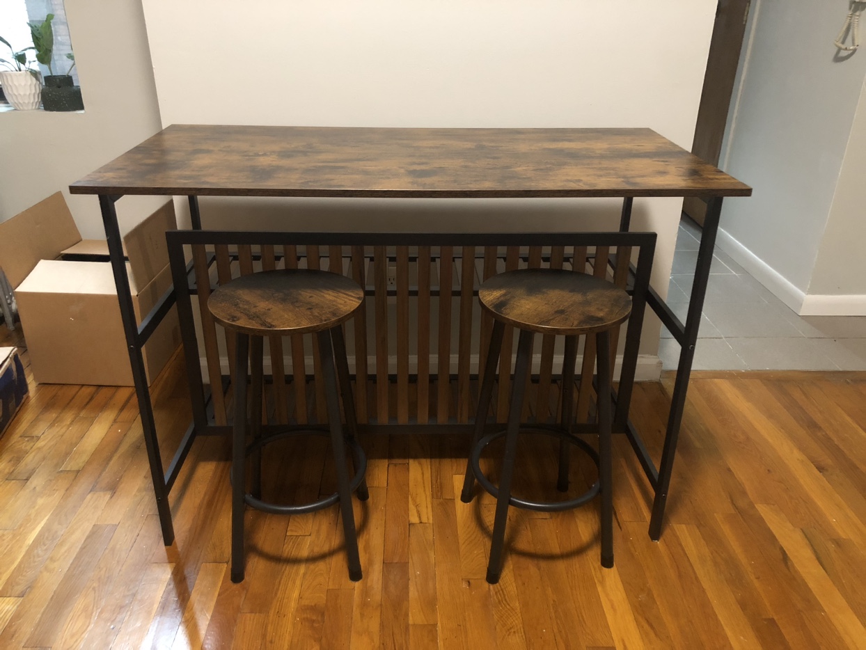 20Kitchen island with two stools and room for appliance storage on the shelves. Great for small spaces — worked well in my studio apartment! 47” L x 23.75” W 33” H Appliance shelves are 10” deep and 12” & 14” high respectively. Has one warped wooden bar (pictured), it arrived that way. Originally from Wayfair. Pick up in East Harlem, 1 flight of stairs. Is light and movable by 1 able-bodied person.