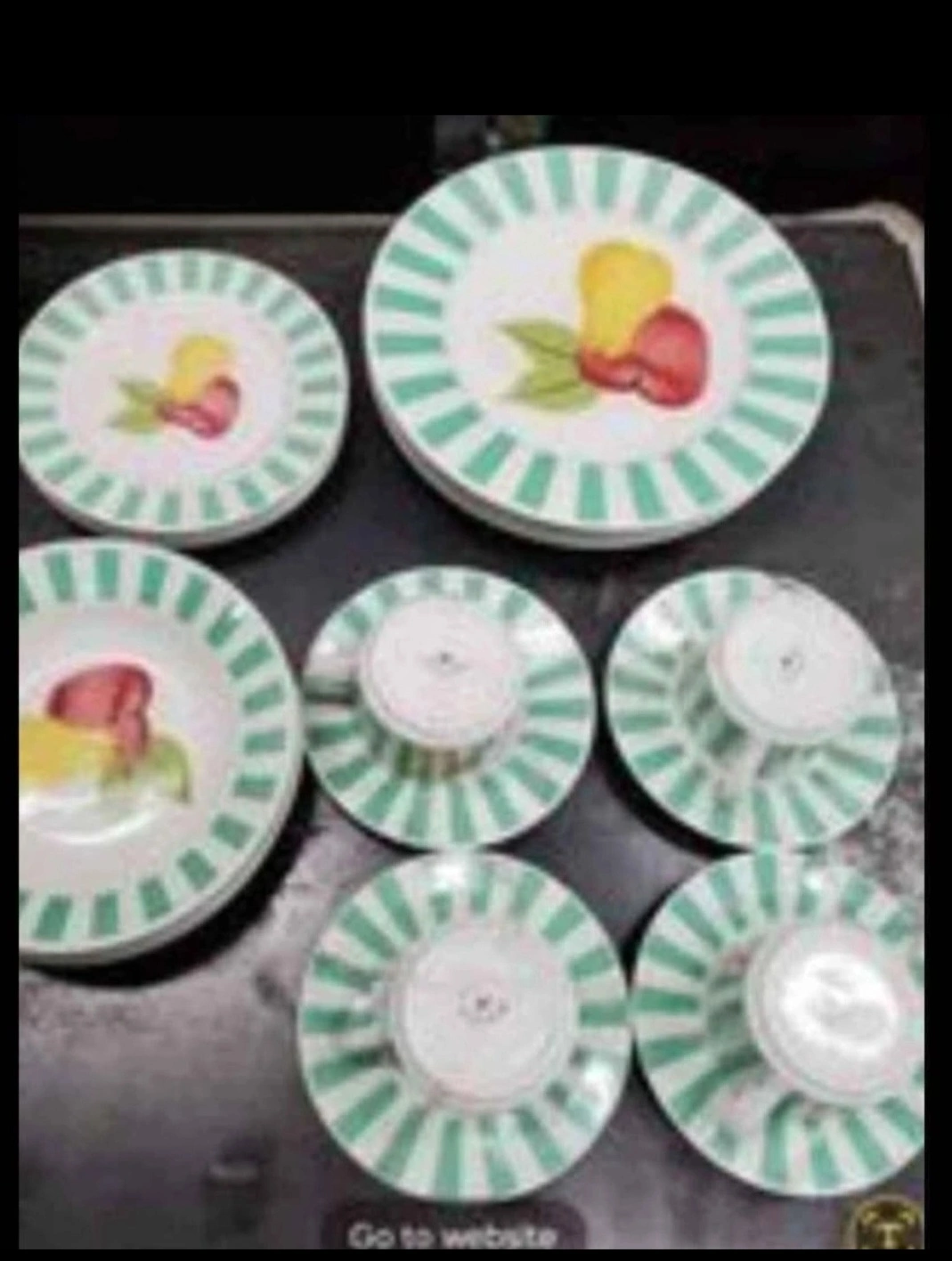 Green and white striped design. cups, saucers, plates, and bowls. Fruit design. for 4 person never been used just collected. perfect condition $35 take offers BUYER HAS TO PICK UP CASH ONLY