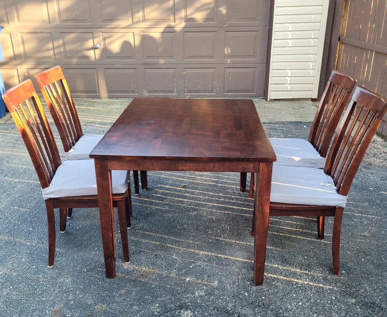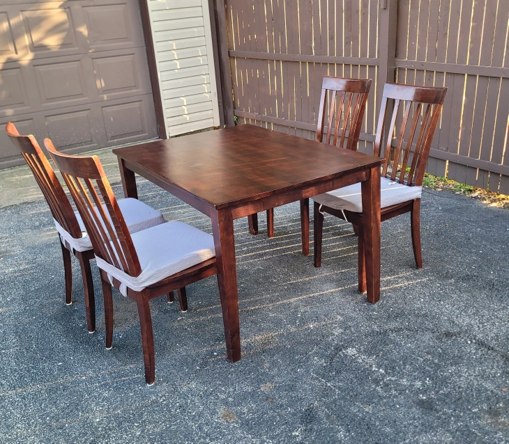20Selling a used kitchen or dining table with four chairs. 76 inches High/92 width by 122 length. The set is a dark brown color and would look great in any dining room or kitchen. It's in good condition very clean and non smoking home and ready to be relocate to a new home. willing to deliver with 10 miles radius for free.