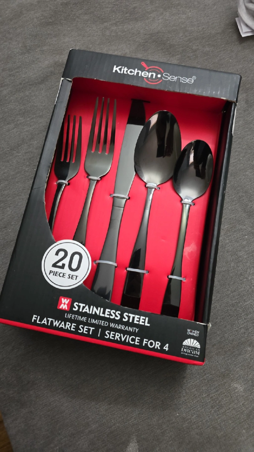 10Selling a brand new Kitchen Sense 20-piece flatware set in black! This stainless steel set is perfect for a service of 4. The set includes tea spoons, dinner spoons, dinner forks, and dinner knives. It's a stylish and complete addition to your dining table
