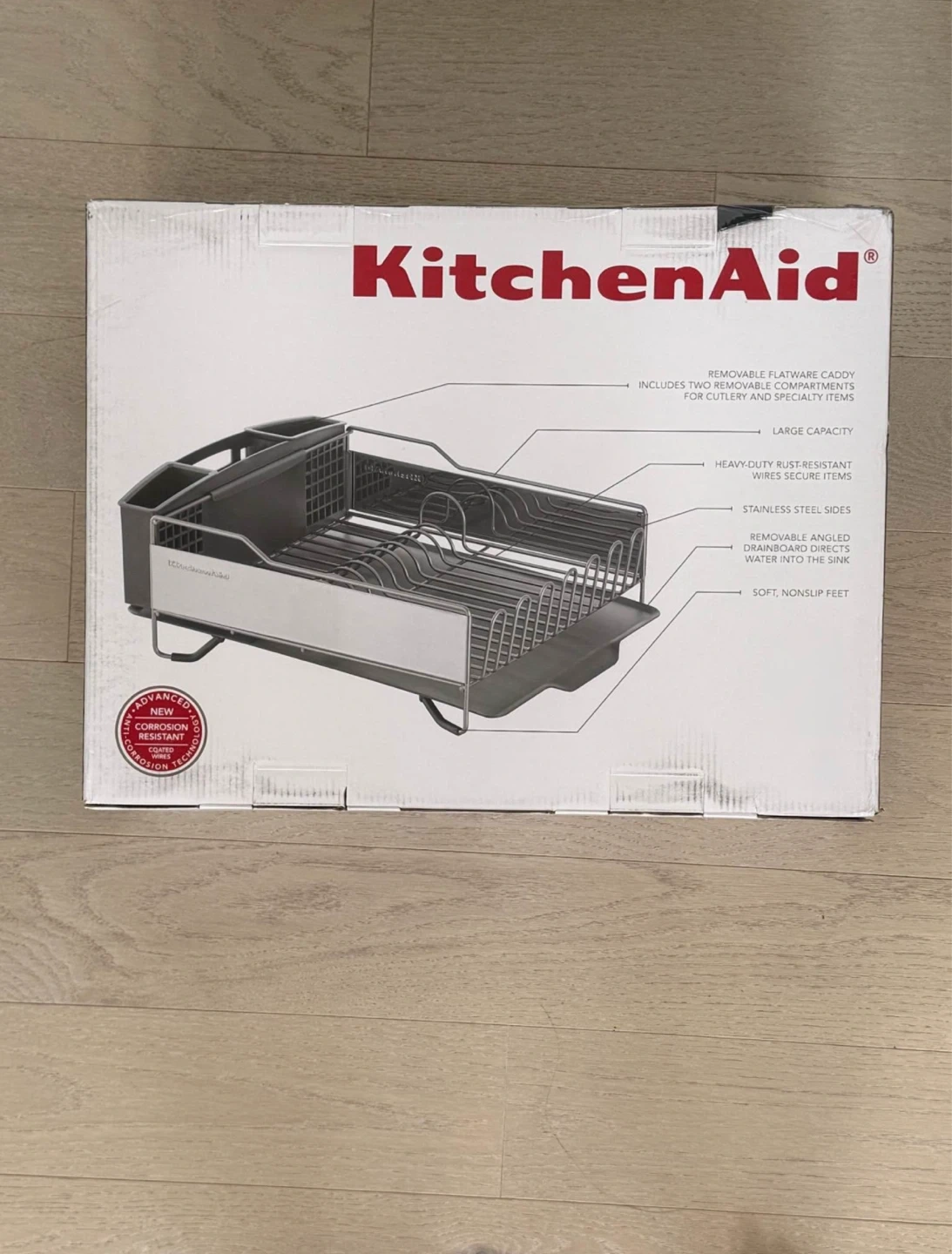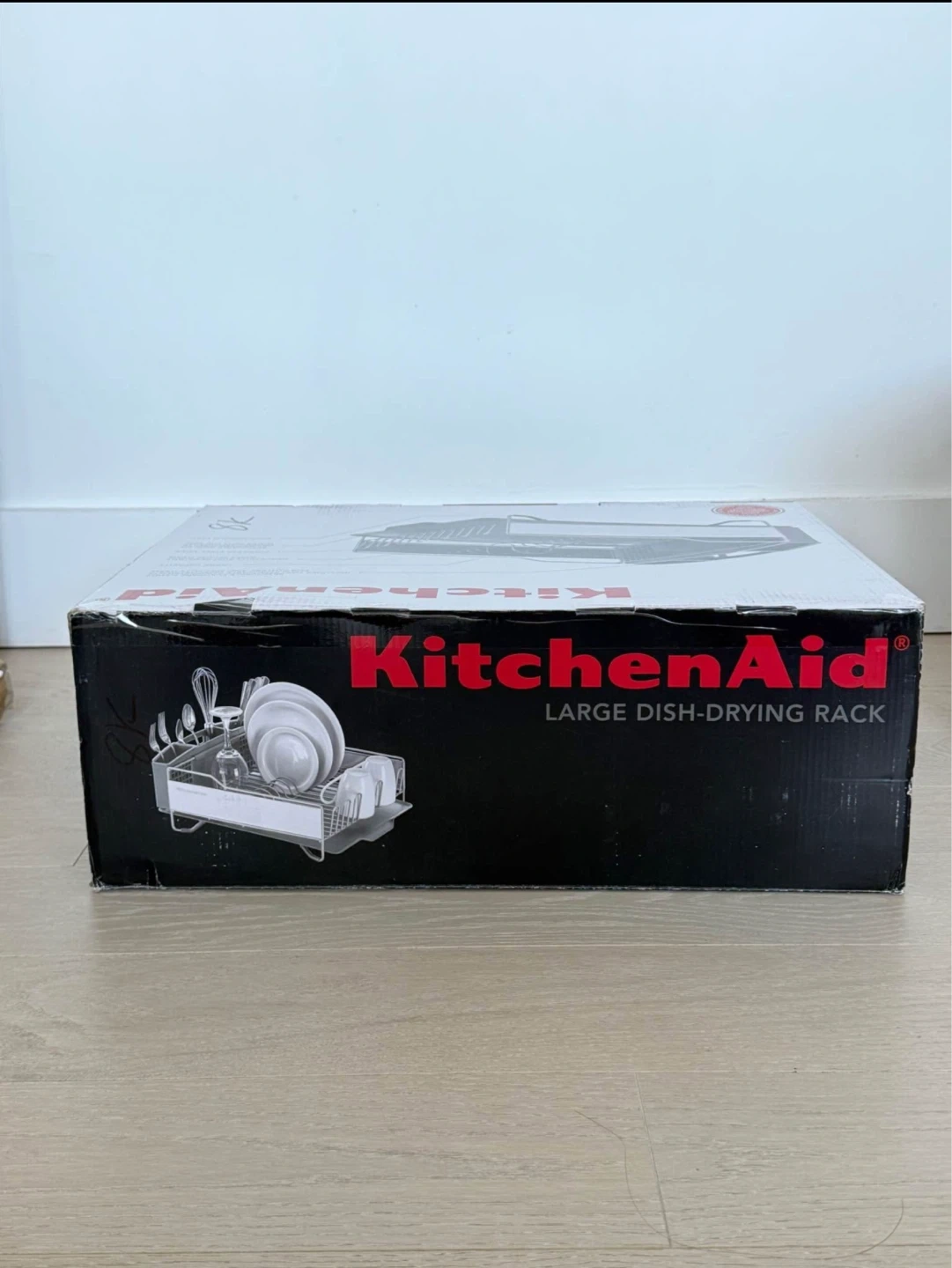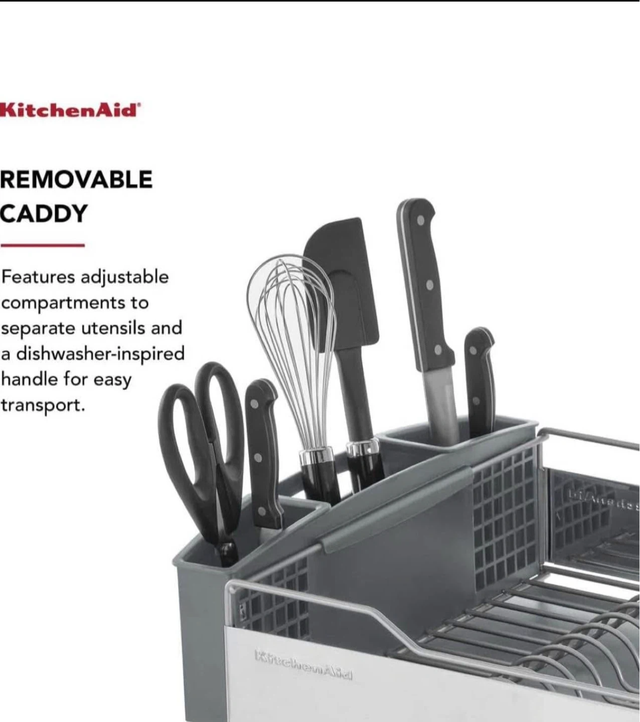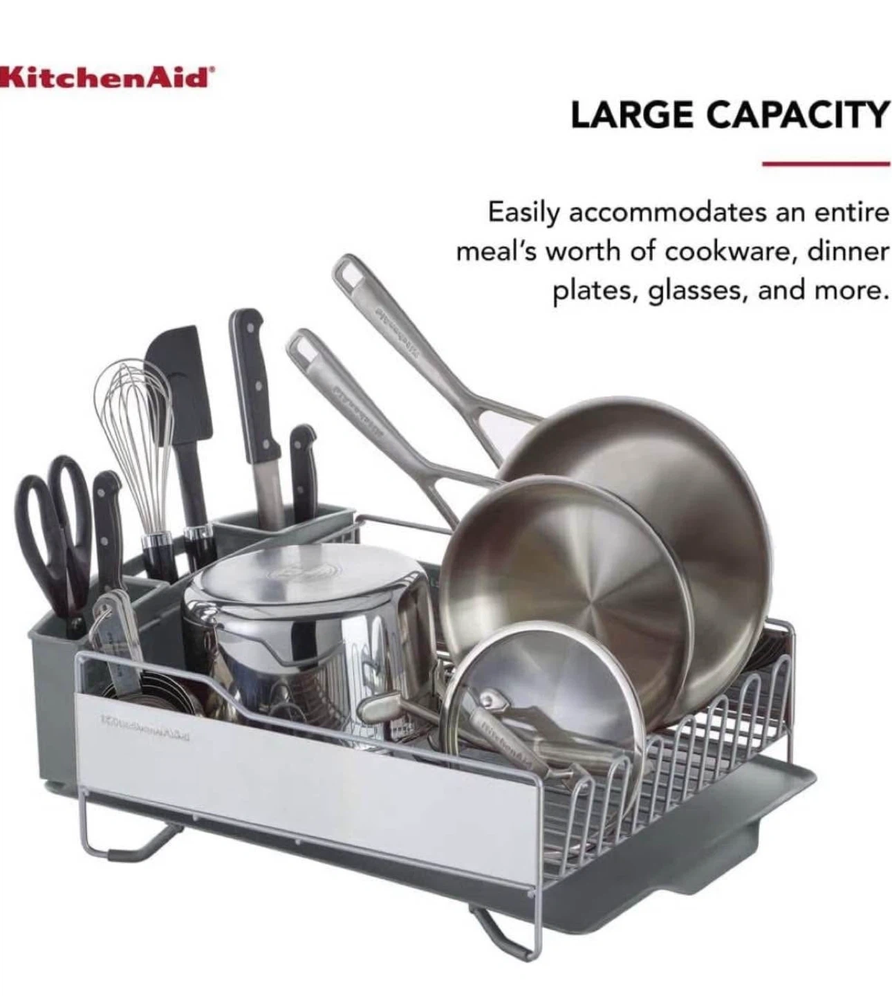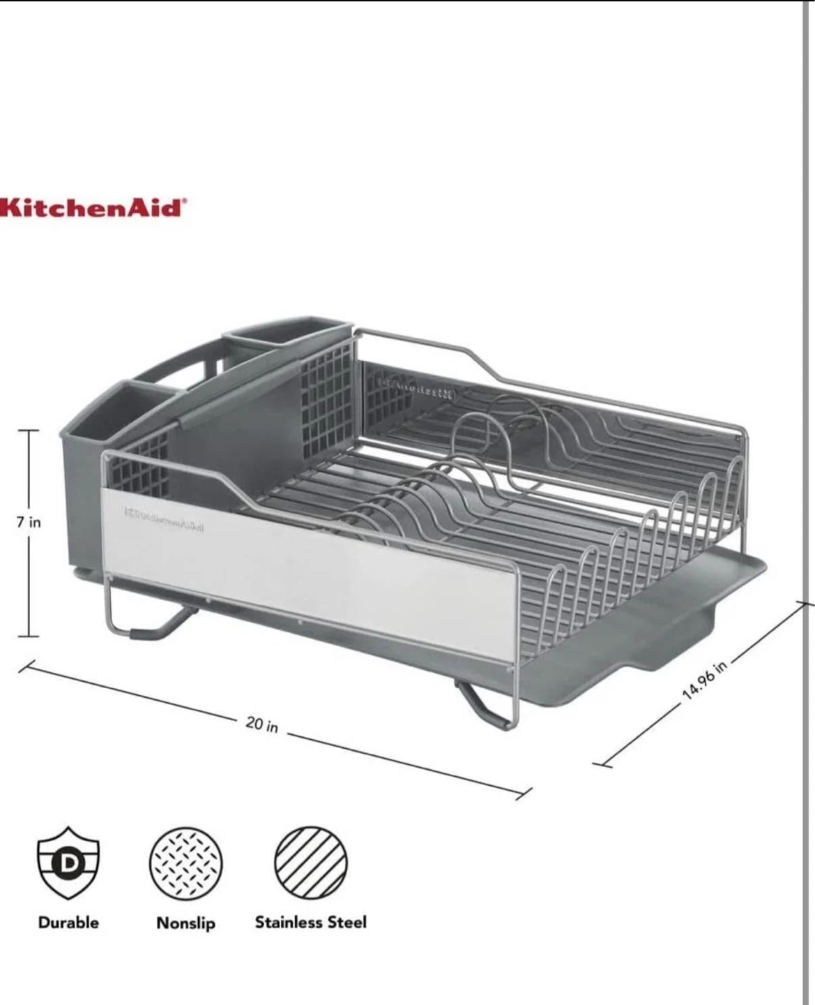 10Selling a KitchenAid Large Dish-Drying Rack in Brand New condition! It features a removable flatware caddy that includes two adjustable compartments for cutlery and specialty items. It has a large capacity to easily accommodate an entire meal's worth of cookware, dinner plates, glasses, and more. The rack also has heavy-duty rust-resistant wires to secure items, stainless steel sides, removable angled drainboard to direct water into the sink, and soft, nonslip feet