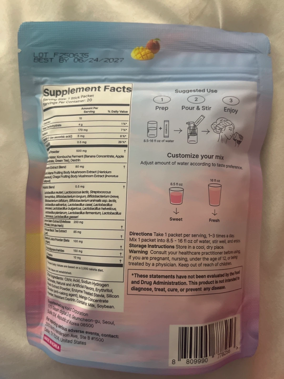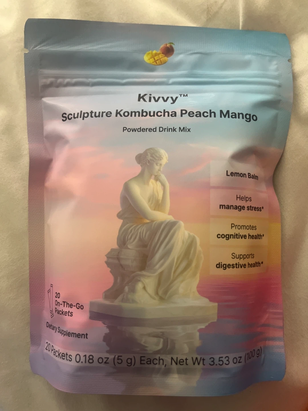 Selling Kivvy Sculpture Kombucha Peach Mango Powdered Drink Mix. - 20 On-The-Go Packets - Dietary Supplement - Helps manage stress - Promotes cognitive health - Supports digestive health Expiration Date: 2024 June 27