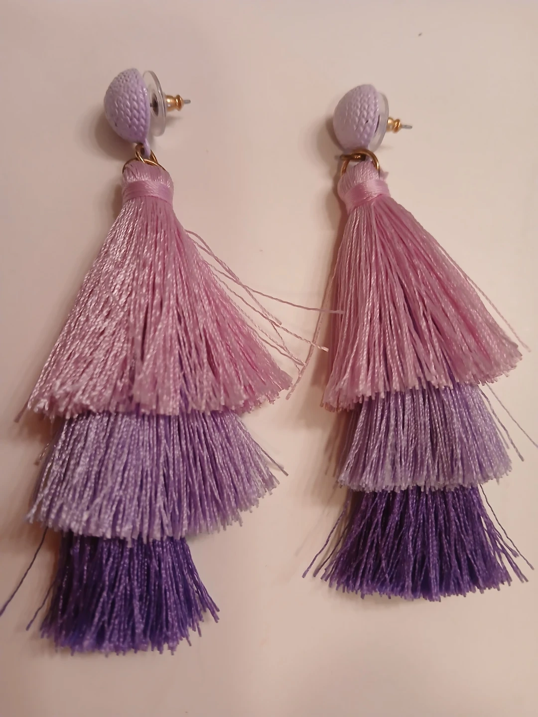 Cute tassel drop earrings in a lovely purple and lavender gradient. These earrings are perfect for adding a pop of color to any outfit!
