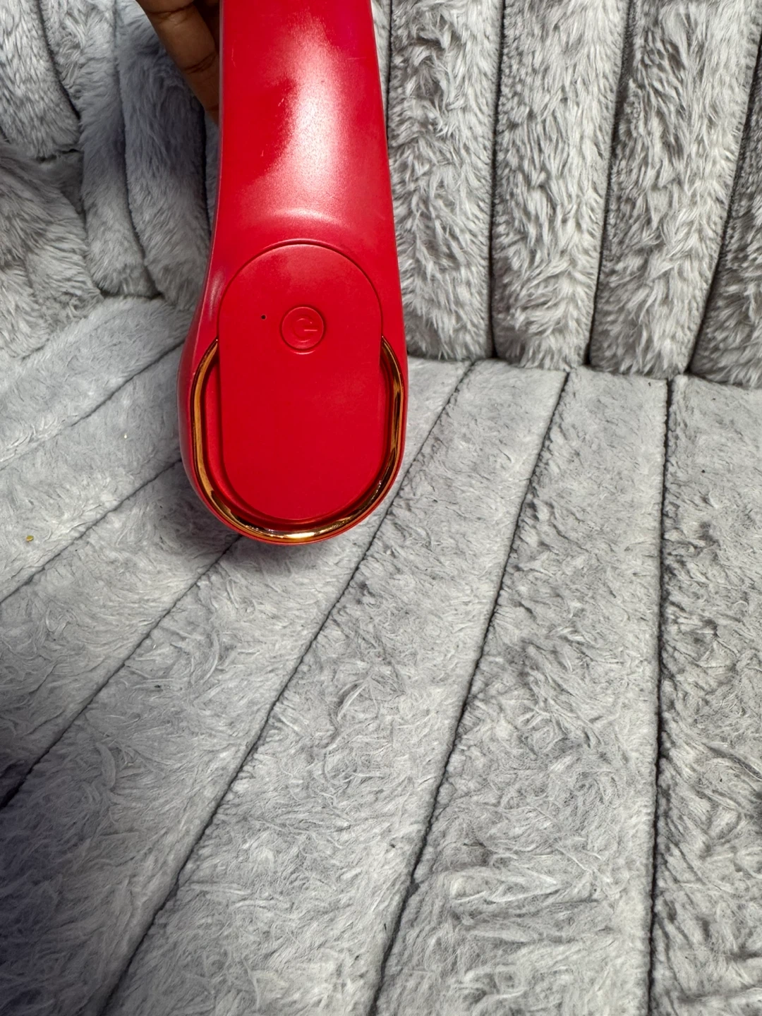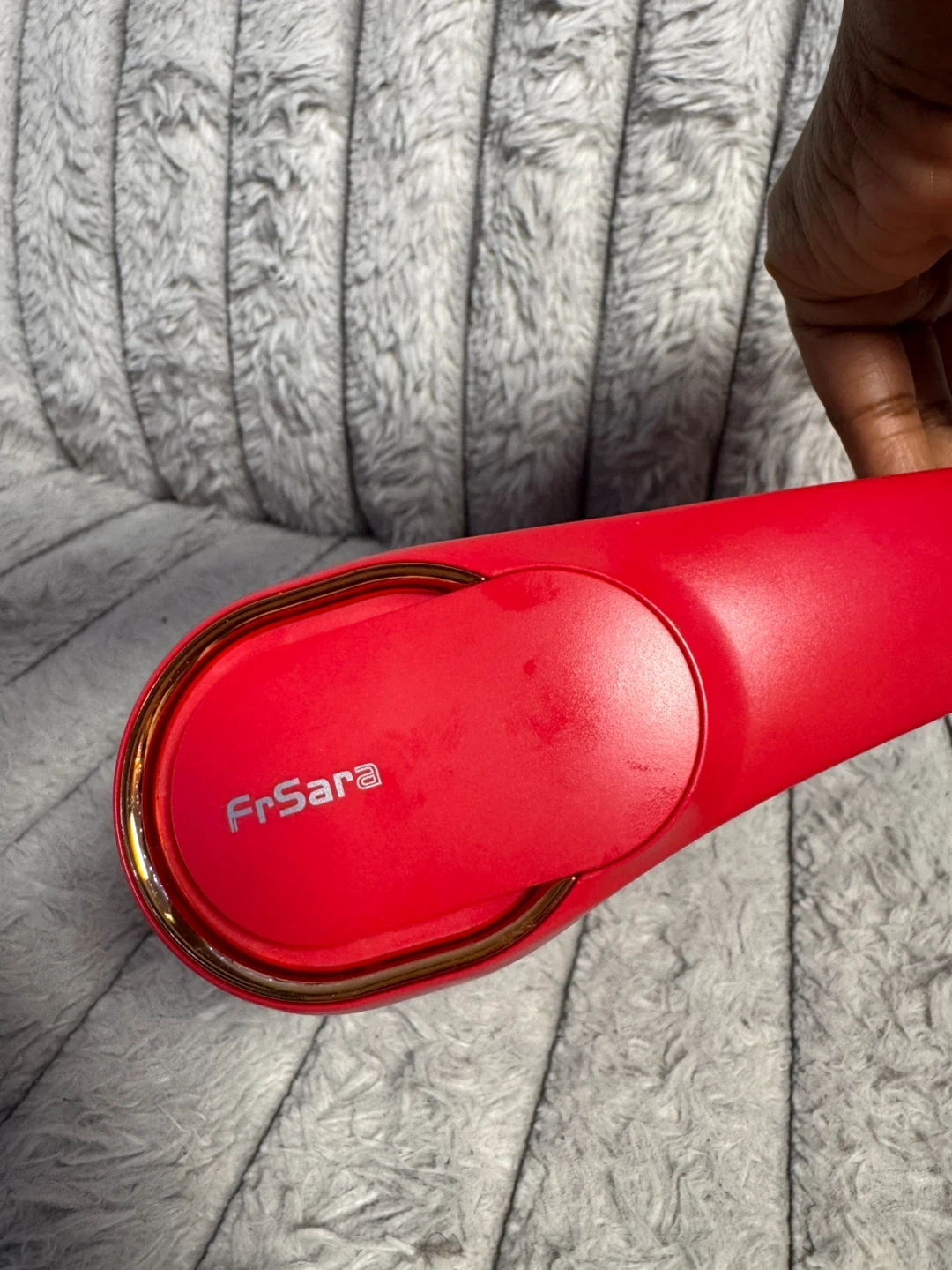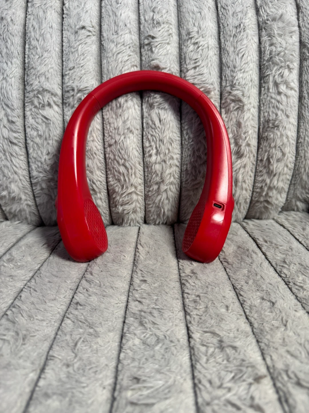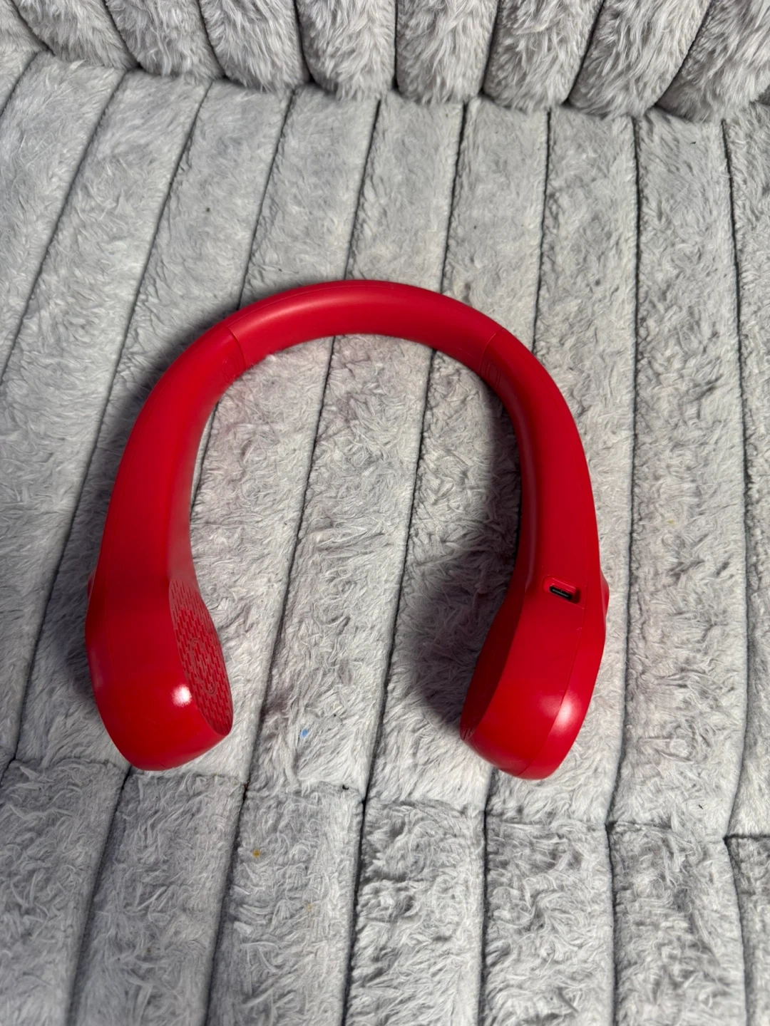 This is a red FrSara wearable neck fan. It's designed to be worn around the neck for hands-free cooling. It has a USB charging port for convenience. Stay cool on the go!