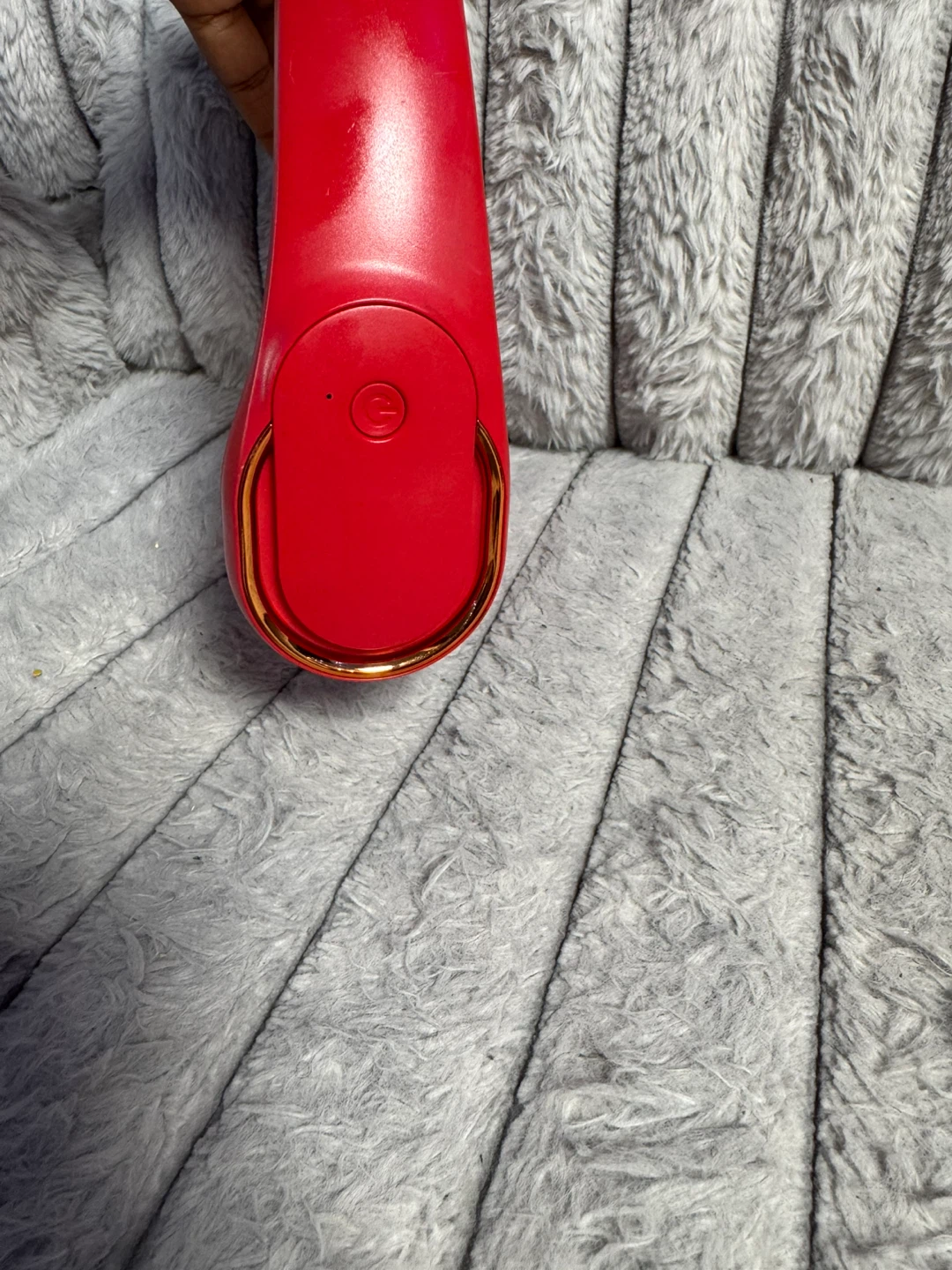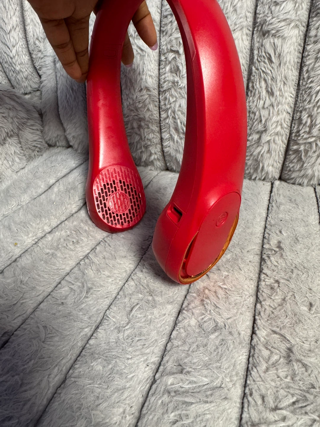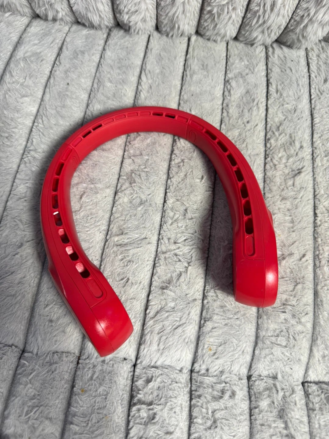 This is a red FrSara wearable neck fan. It's designed to be worn around the neck for hands-free cooling. It has a USB charging port for convenience. Stay cool on the go!