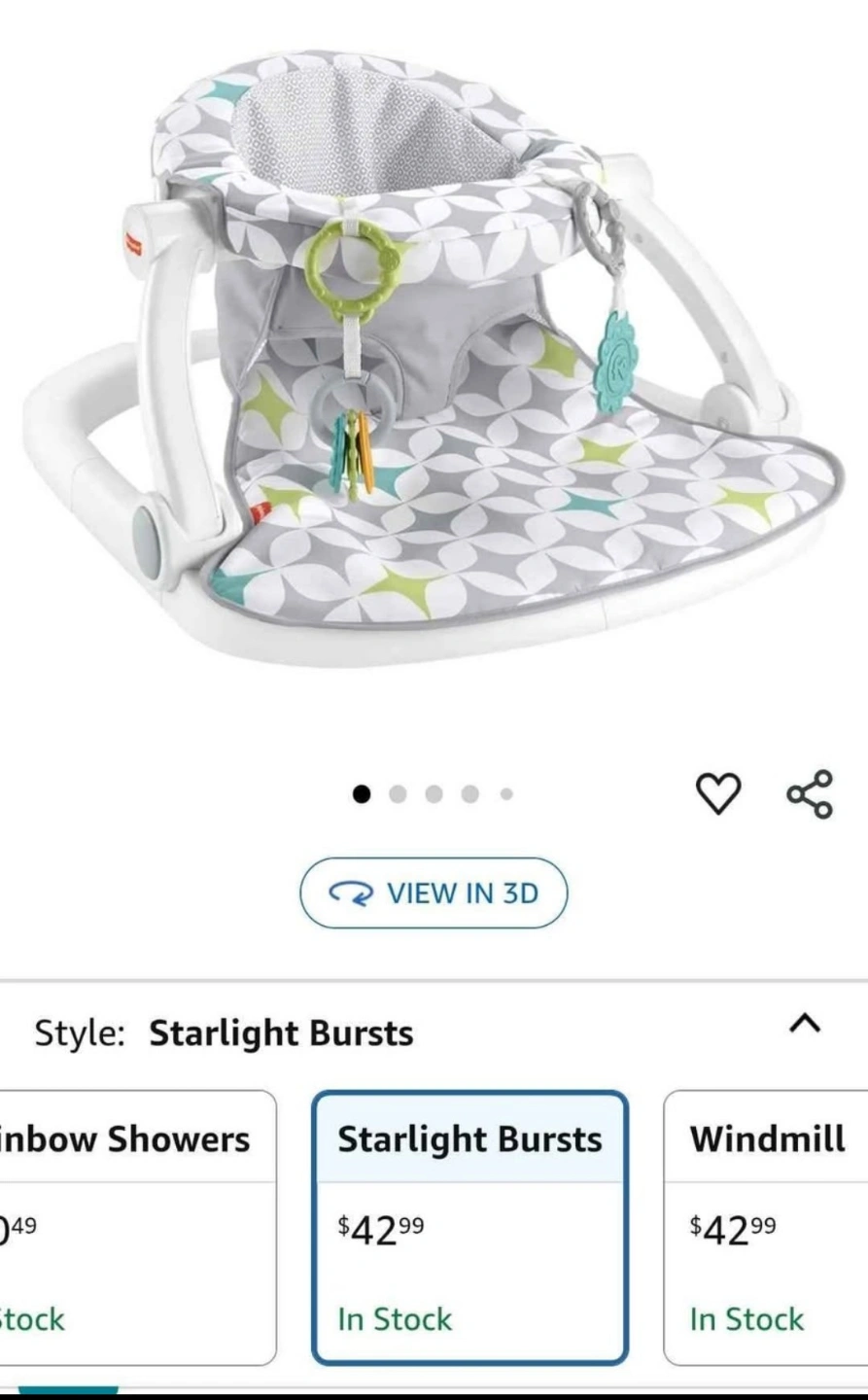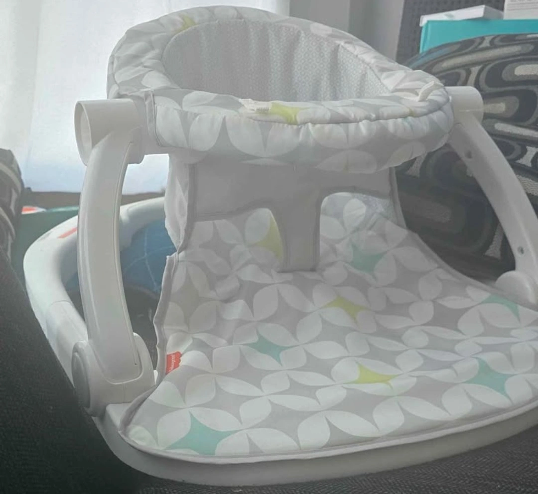 Infant floor seat. Supports baby's upright sitting. Soft padded fabric. Compact design. Easy to store.