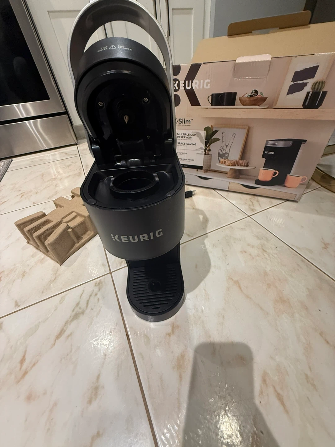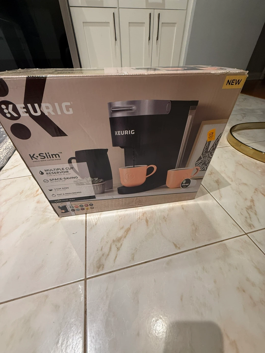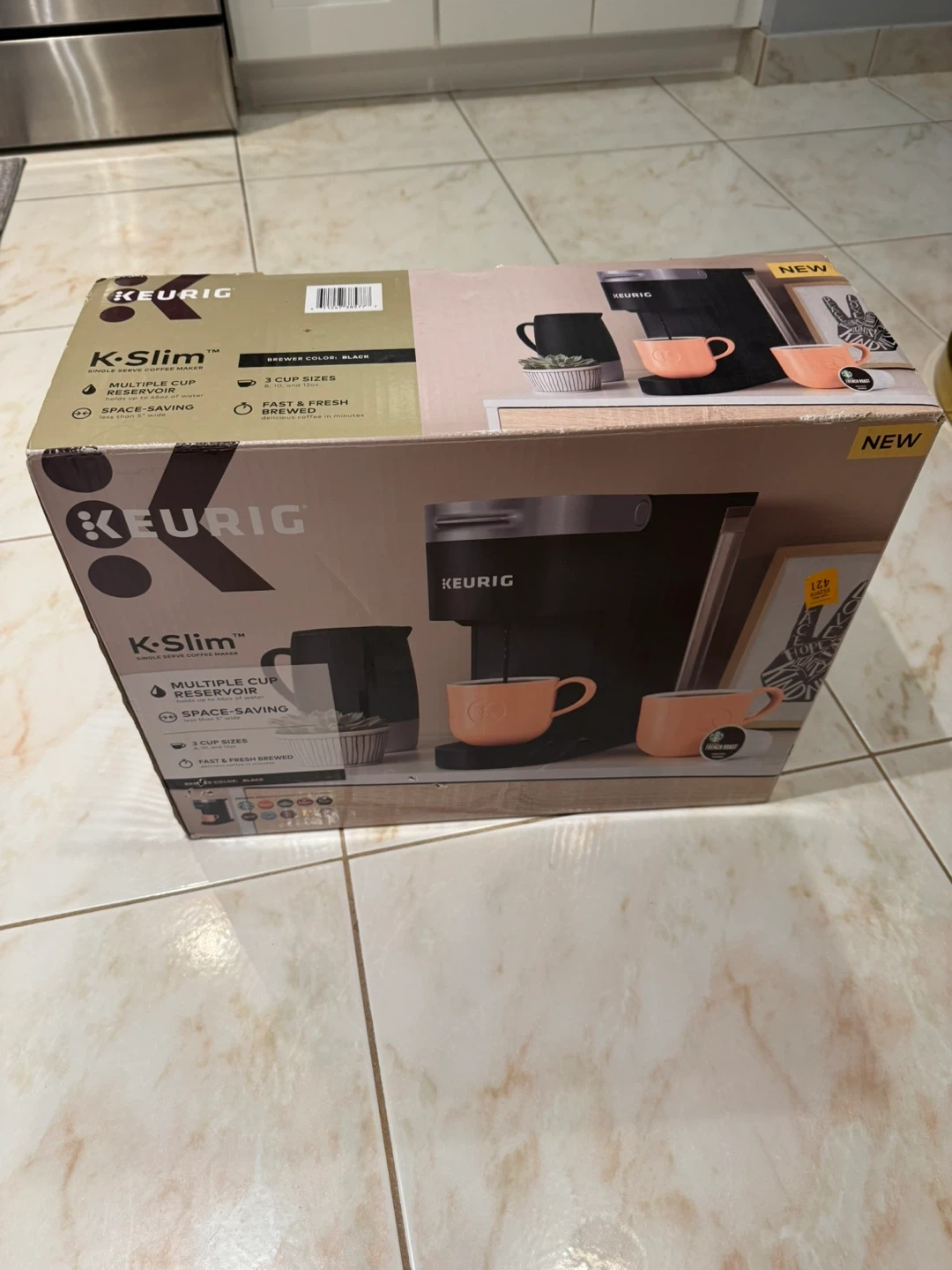 Selling a Keurig K-Slim single serve coffee maker in black. It's in great condition and comes with the box. This space-saving coffee maker features a multiple cup reservoir and brews fast and fresh coffee!