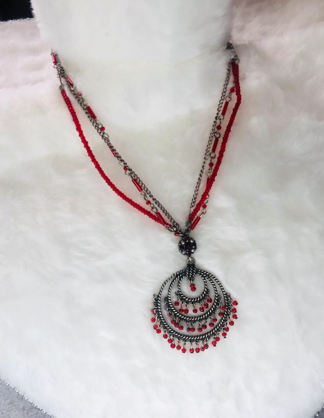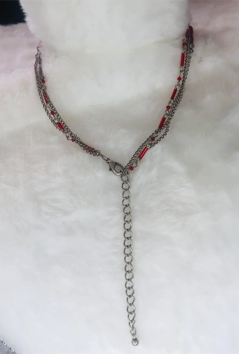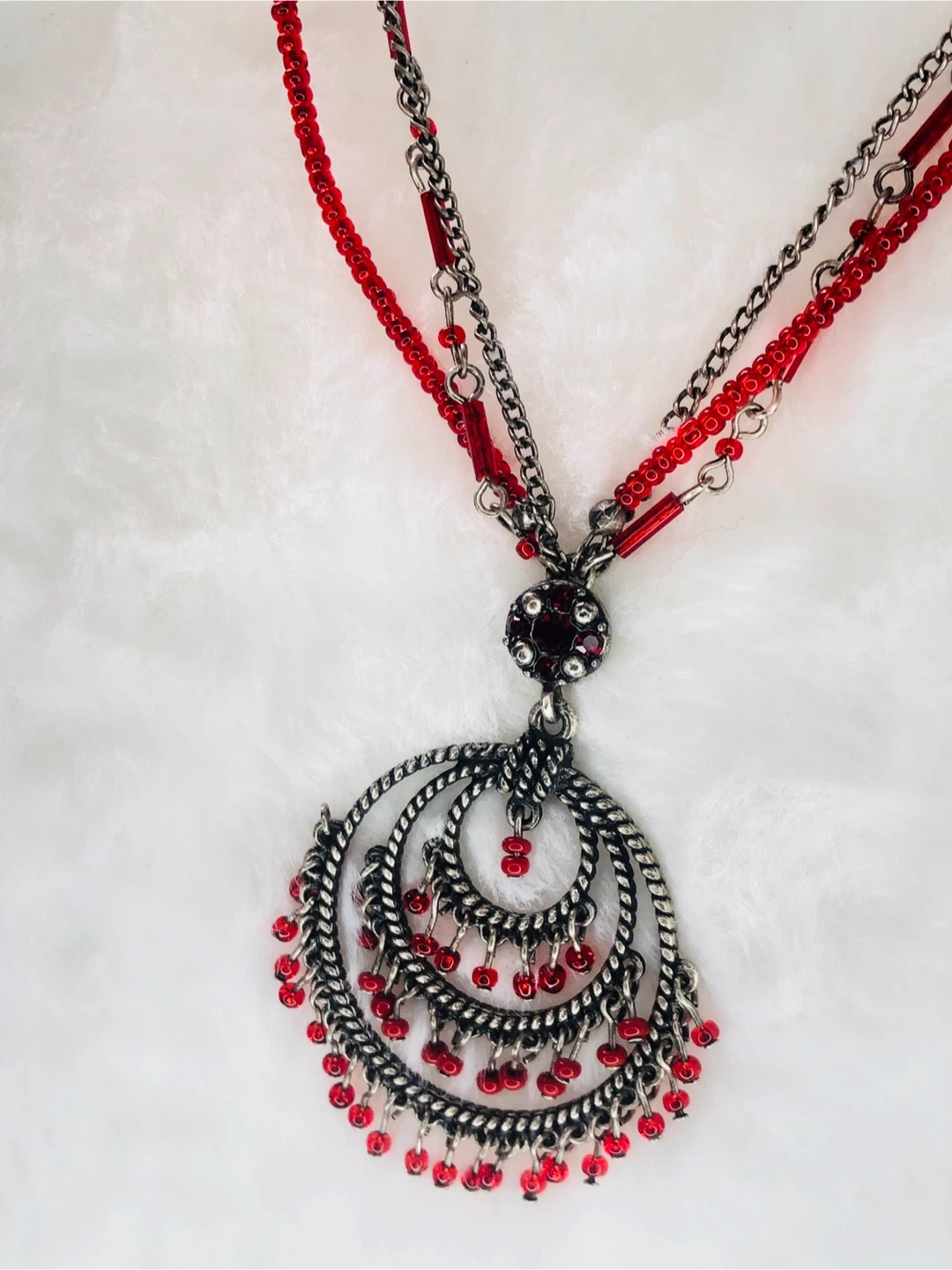 This necklace features multiple delicate silver-tone chains layered together. Red beads and small red accents are incorporated throughout the chains and dangle from the ornate chandelier-style pendant. It includes an adjustable extender for a perfect fit!