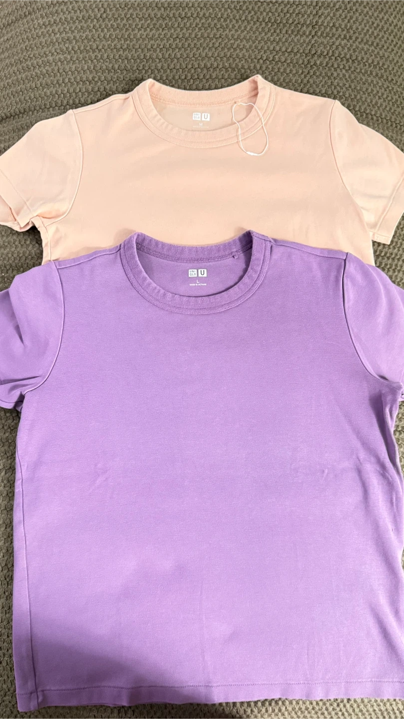 Two Uniqlo U t-shirts, one in a soft pink and the other in lavender purple. The pink tee is size medium and the purple tee is size large. Both are made of comfortable cotton. Great basics for everyday wear!