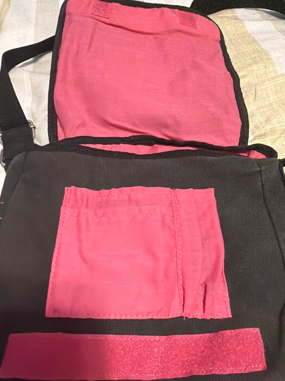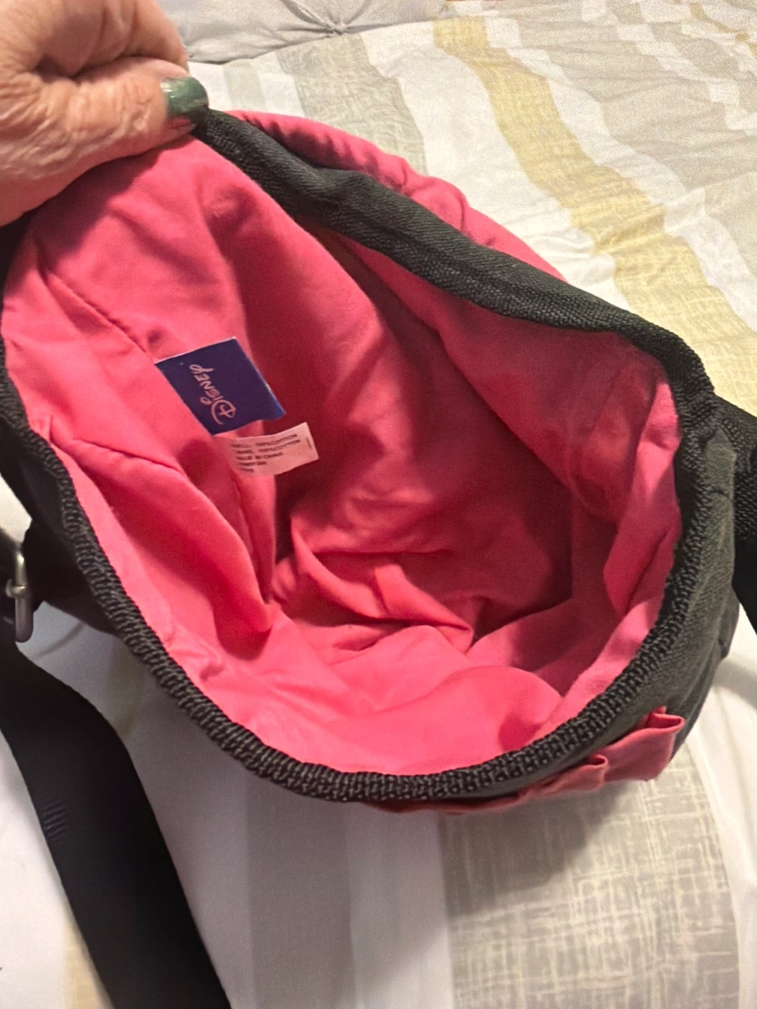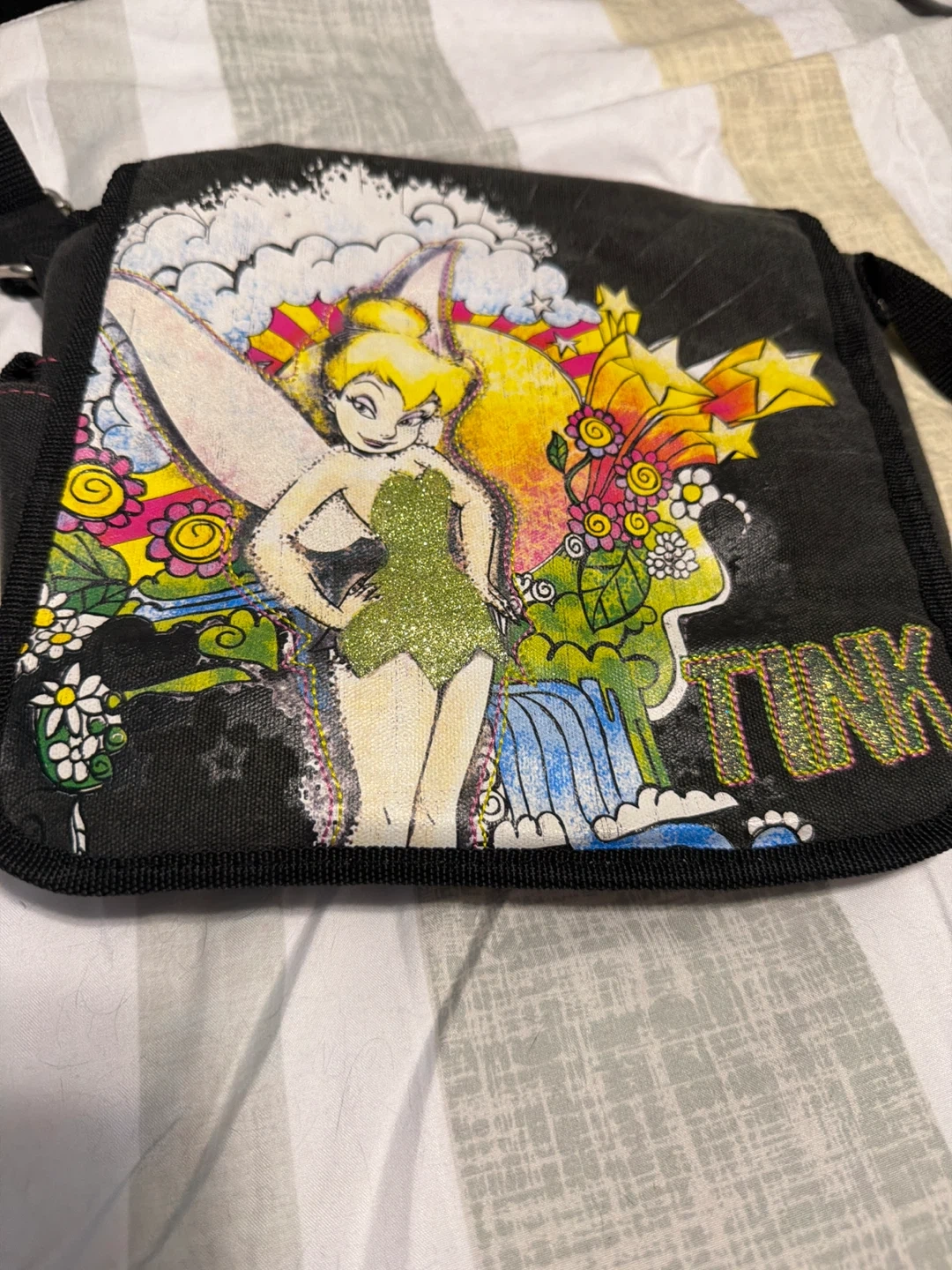 This black crossbody bag features a vibrant Tinkerbell graphic on the front. It has a bright pink interior with a small pocket. Perfect for carrying essentials on the go!