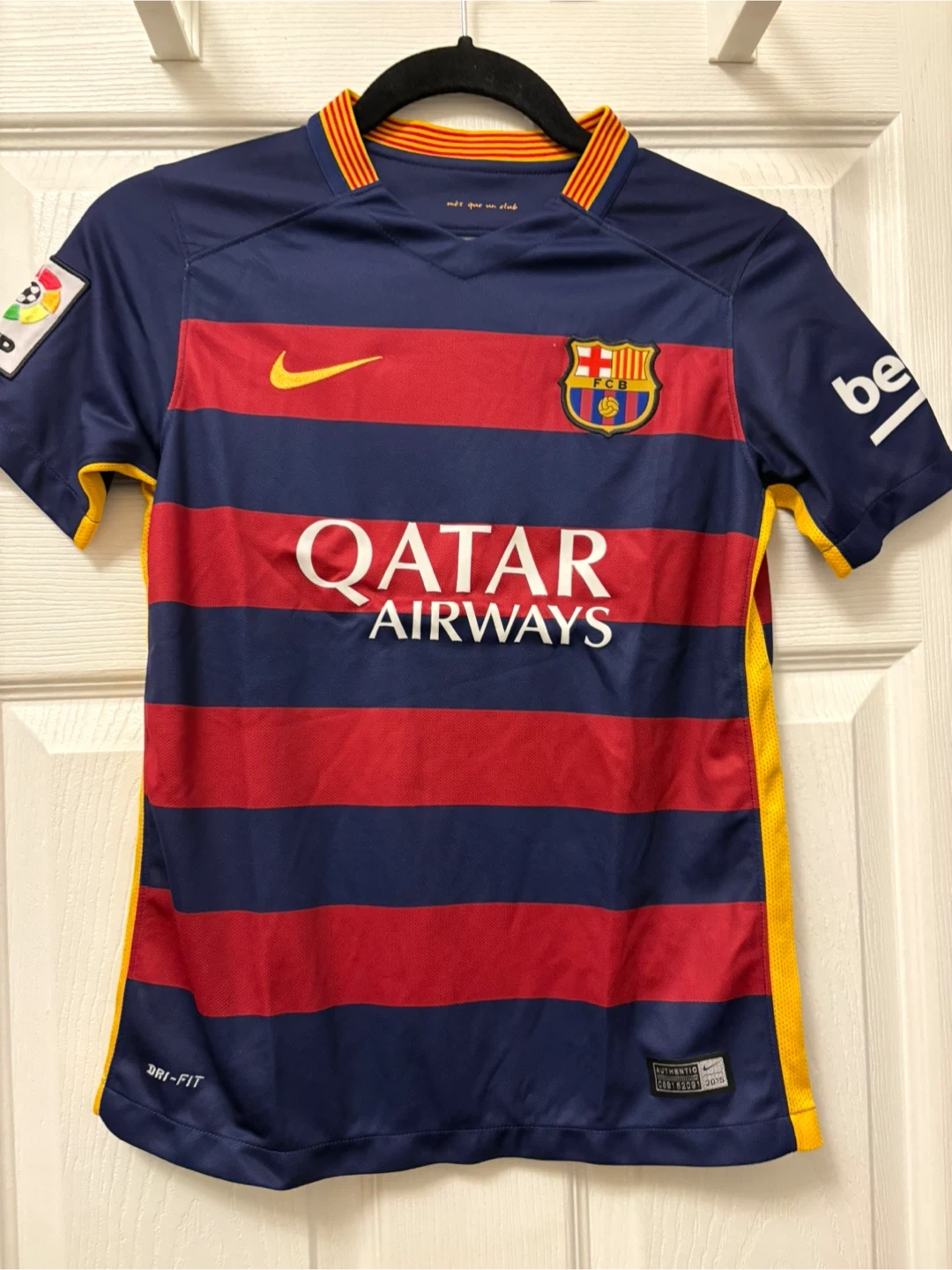 This is an FC Barcelona soccer jersey by Nike. It's made with Dri-FIT fabric for moisture-wicking. Size Small Includes "més que un club" inside the collar.