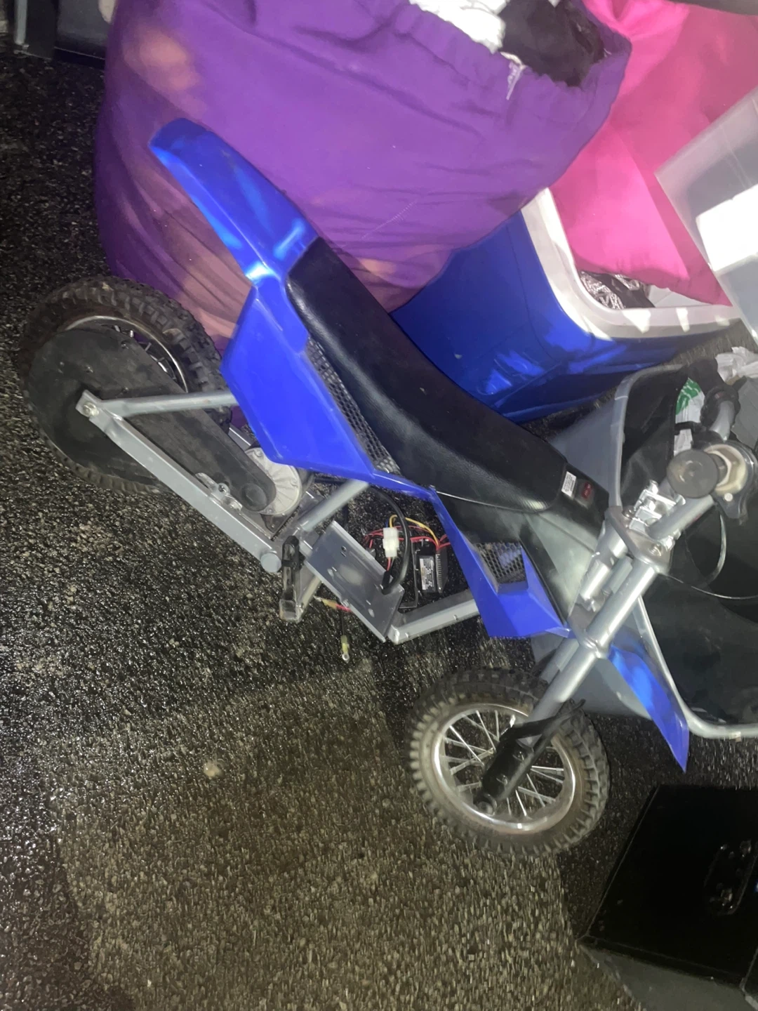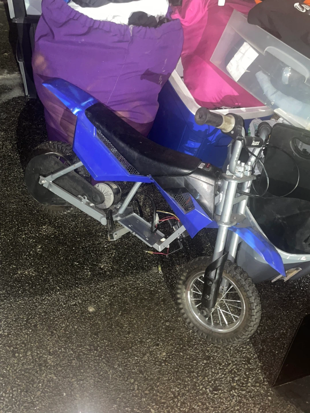Blue Razor MX350 electric dirt bike. Chain-driven motor. Speeds up to 15 mph. Max rider weight 140 lbs. Recommended for ages 13 and up. This bike is designed for off-road use. Some stuff missing