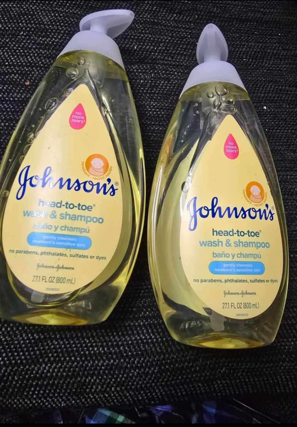 Two bottles of Johnson's head-to-toe wash and shampoo. Gently cleanses newborn and sensitive skin. No parabens, phthalates, sulfates or dyes.