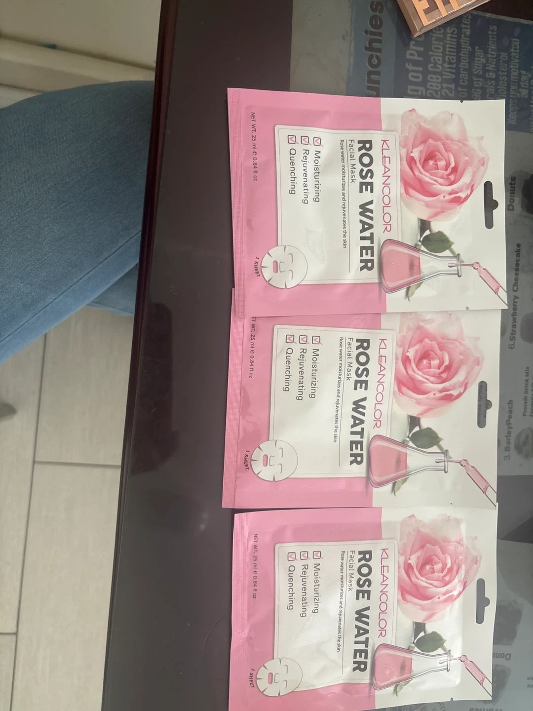 I'm selling three KleanColor Rose Water facial masks. These masks are designed to moisturize, rejuvenate, and quench your skin. Each sheet contains 25 ml / 0.84 fl oz of product.