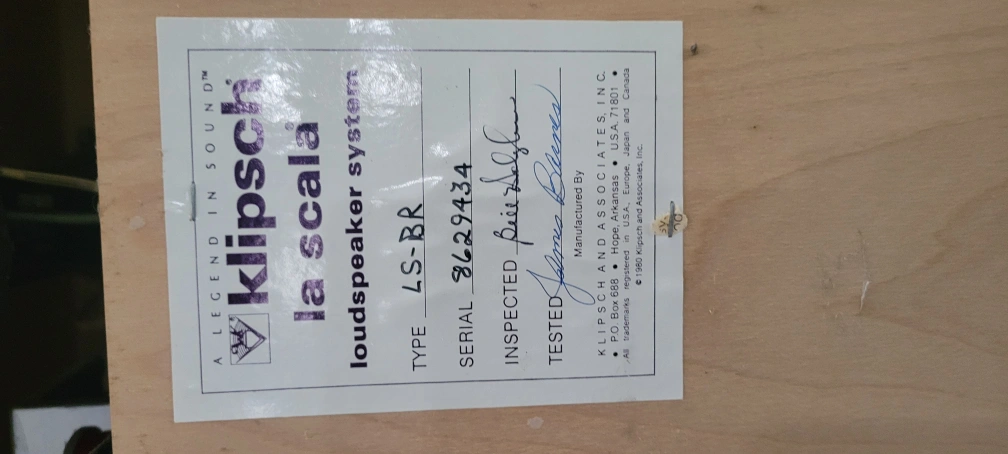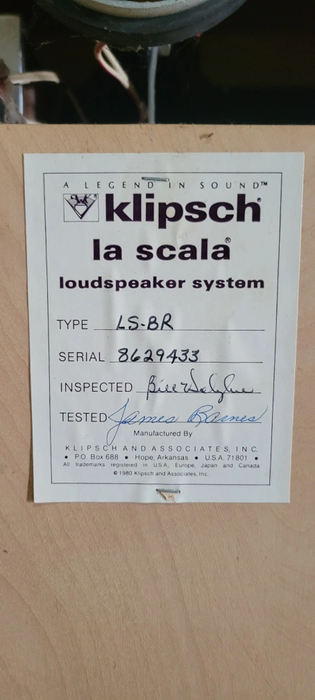 Selling a Klipsch La Scala loudspeaker system, type LS-BR. Inspected by Bill Daughhe and tested by James Brence. Great for any sound enthusiast!