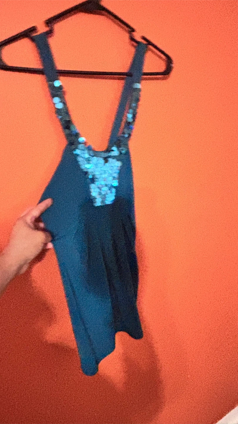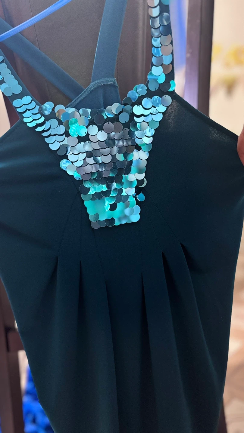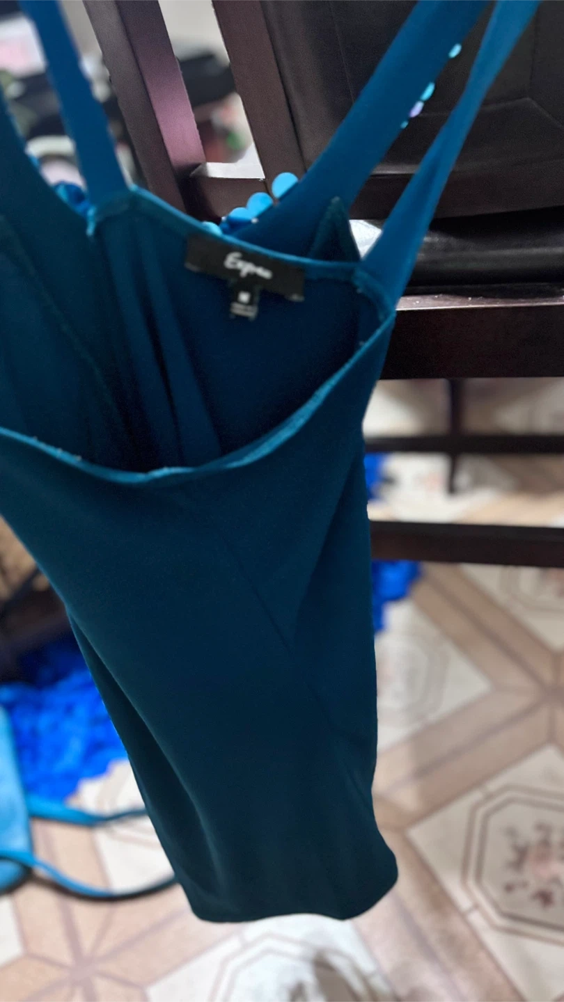 This Express tank top features beautiful blue and silver sequins on the straps and neckline. It's a gorgeous teal color with a flowing fit and a v-neck. Perfect for a night out!