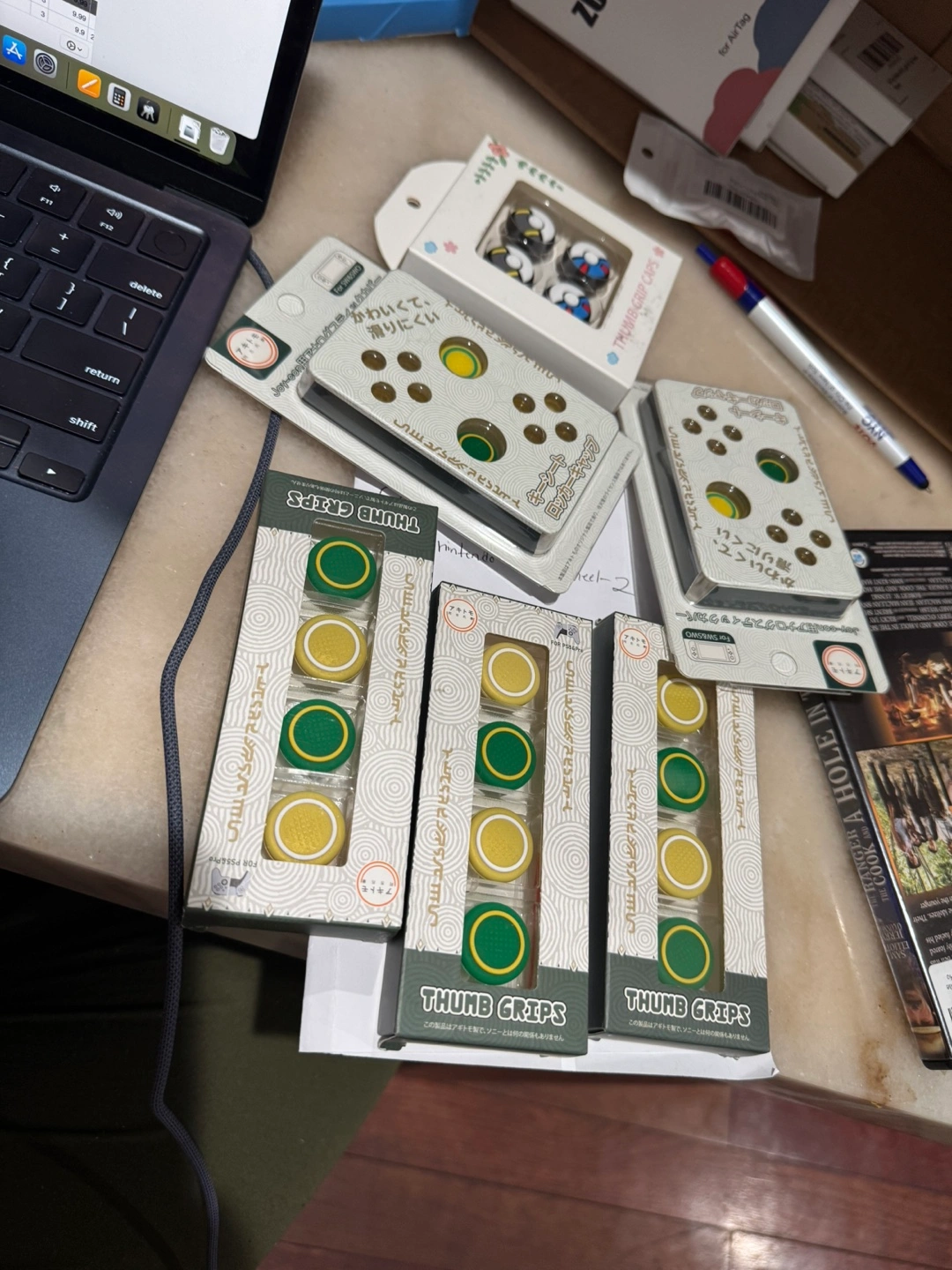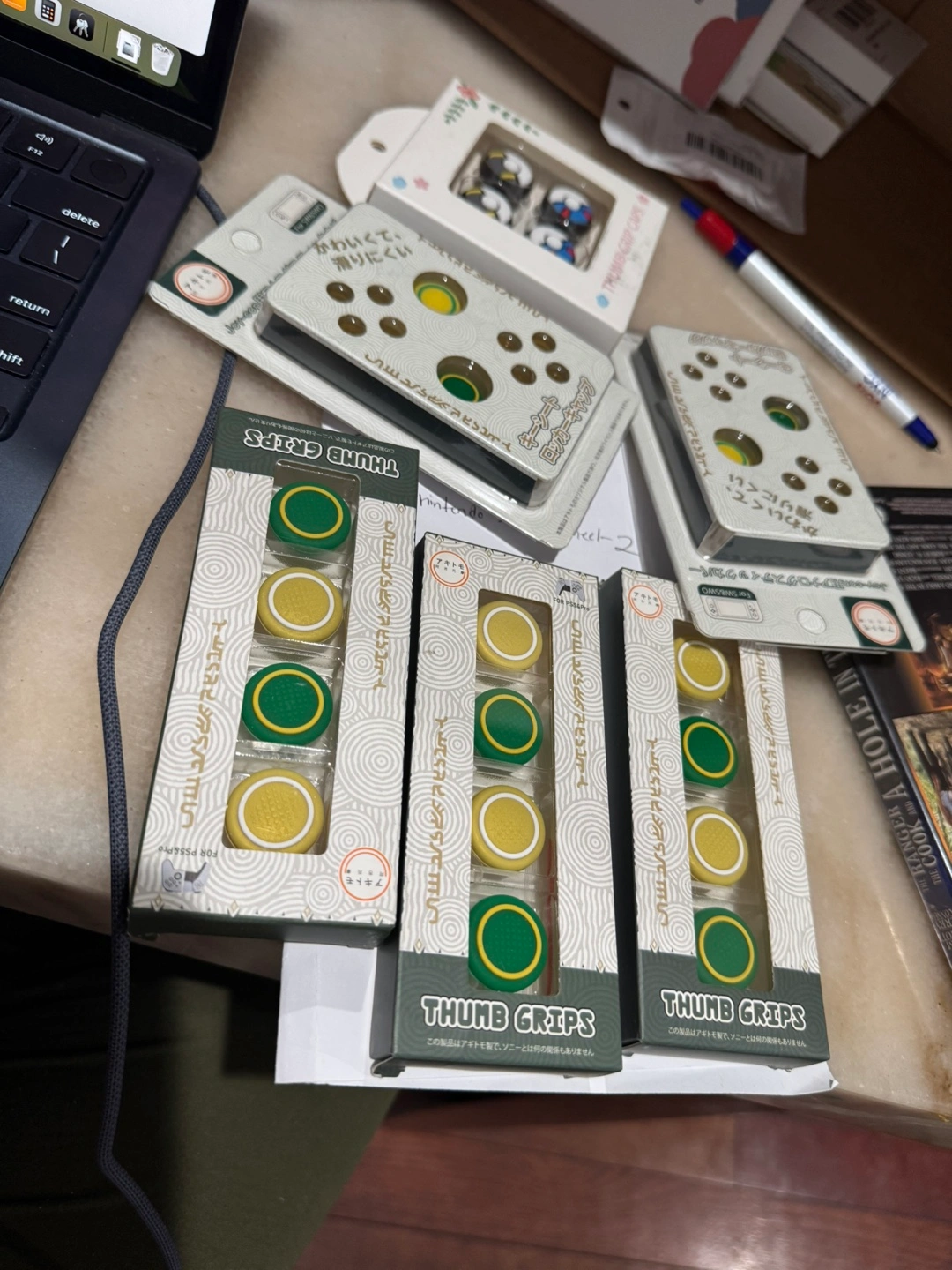 New thumb grips for controllers. Multiple sets available. Green and yellow color scheme. Great for improved gaming experience. Easy to install.