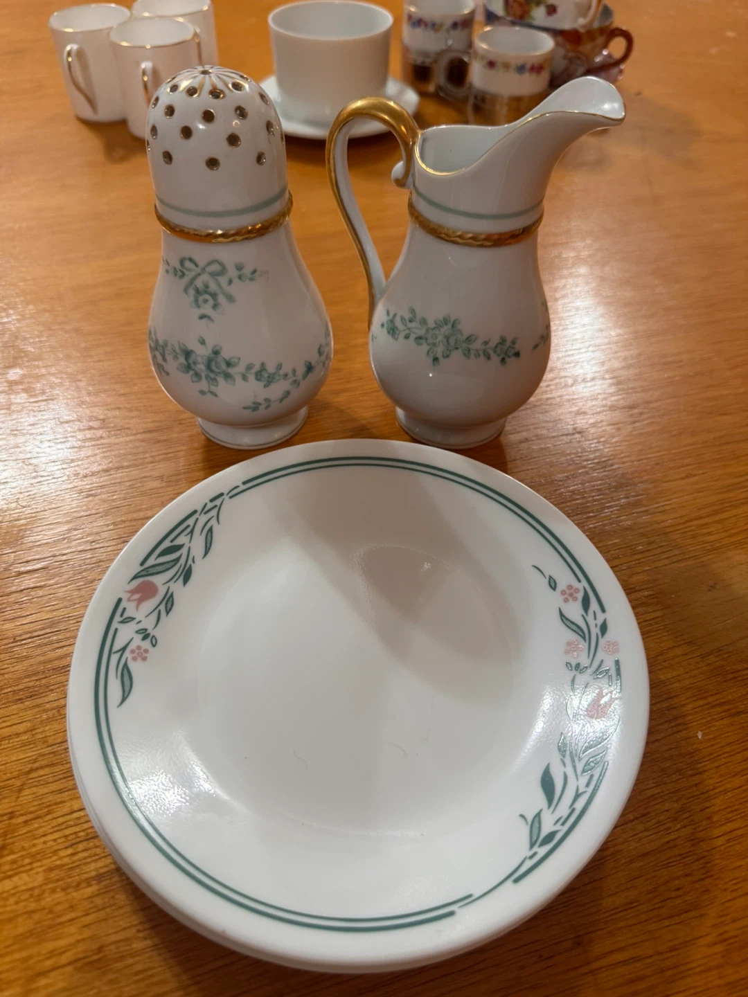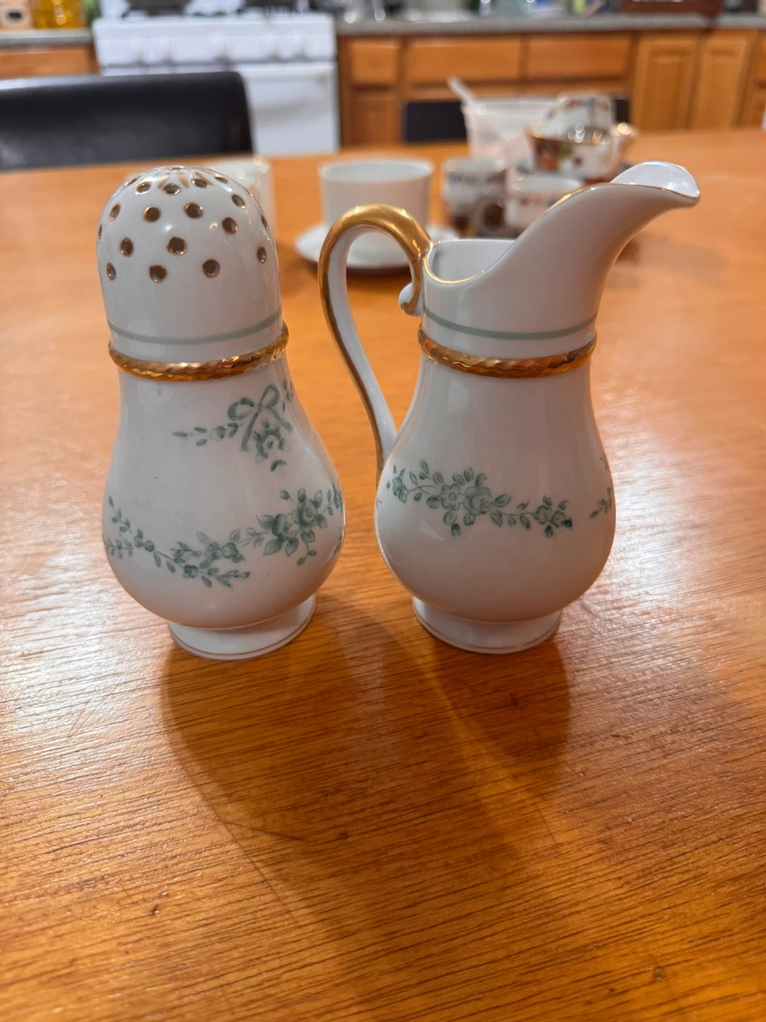 Selling a charming vintage porcelain creamer and salt shaker set. They feature delicate floral designs and gold trim, adding a touch of elegance to any table setting