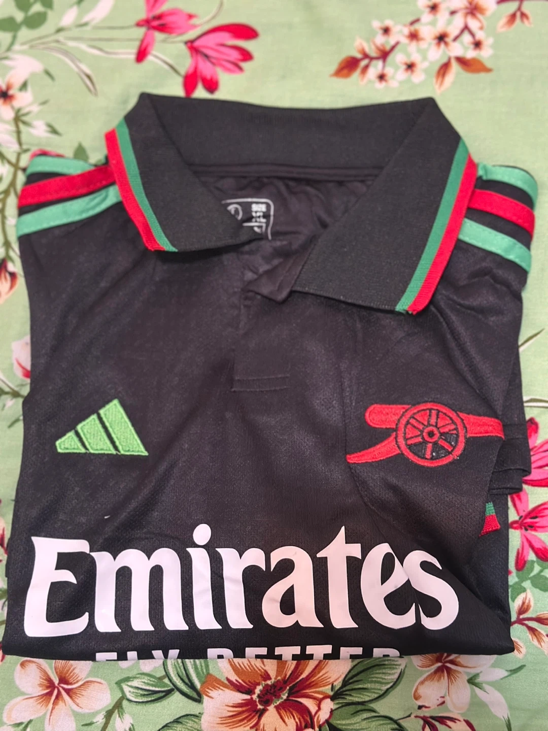 This is an Arsenal football jersey.size XL,XXL It's black with red and green trim on the collar and sleeves. Features the Emirates logo and the Arsenal cannon crest. Adidas logo is also present.