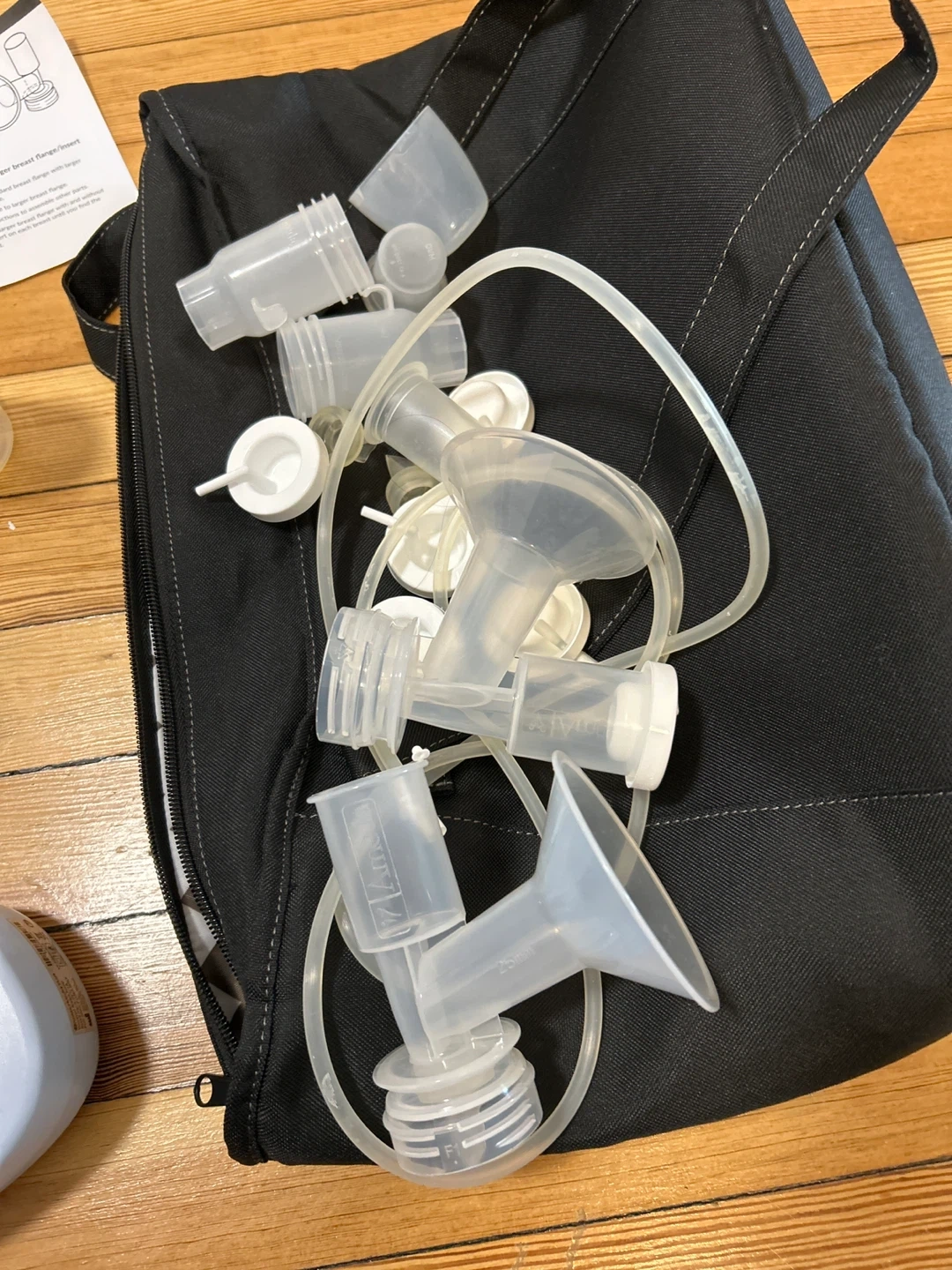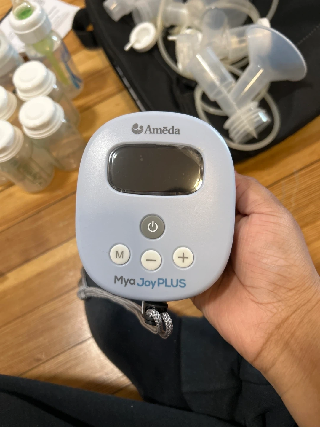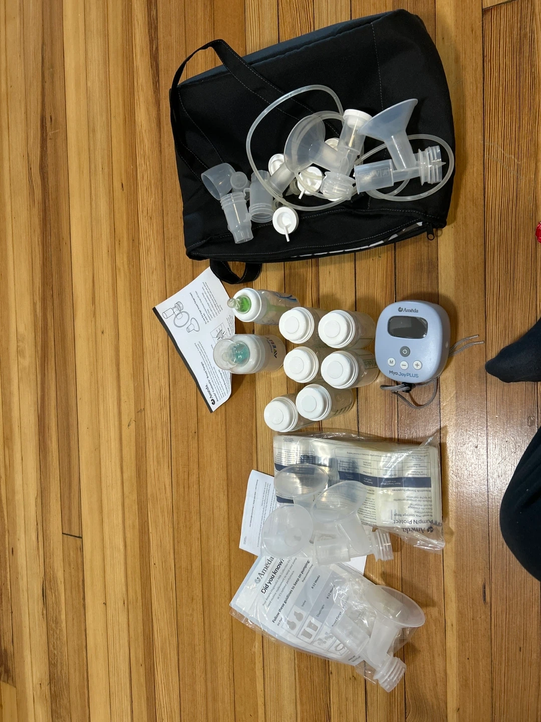 This is an Ameda Mya Joy PLUS double electric breast pump. It includes a black storage bag with various breast pump accessories and several milk collection bottles. The pump has a digital display and adjustable settings. I opened it but it was never used