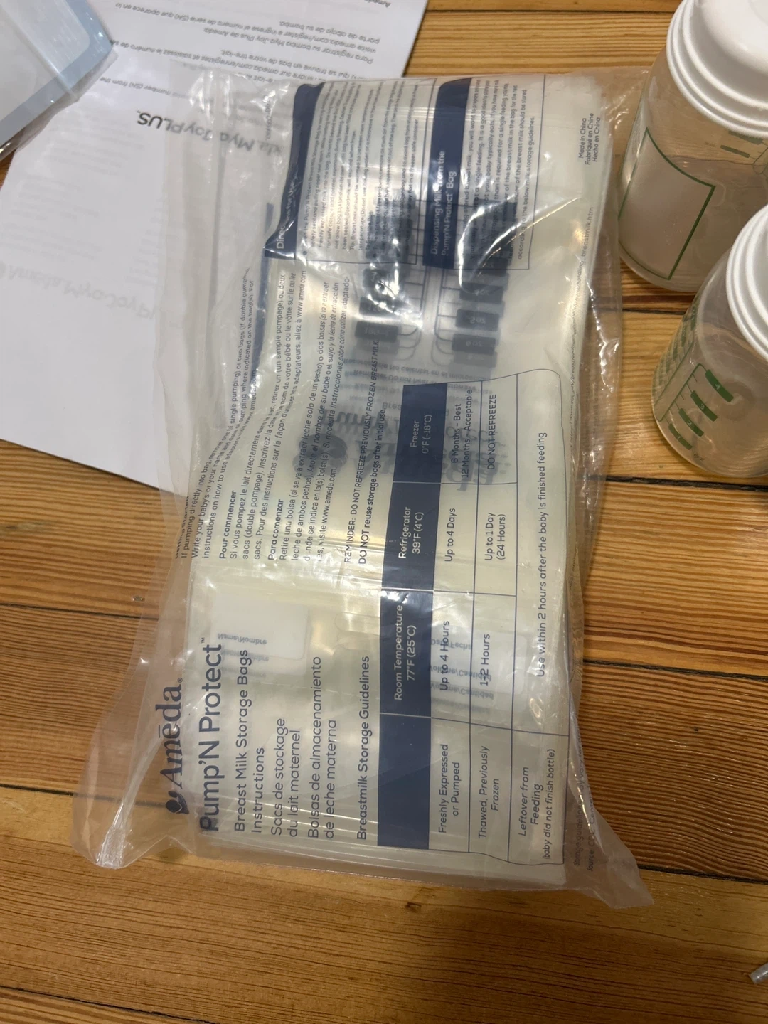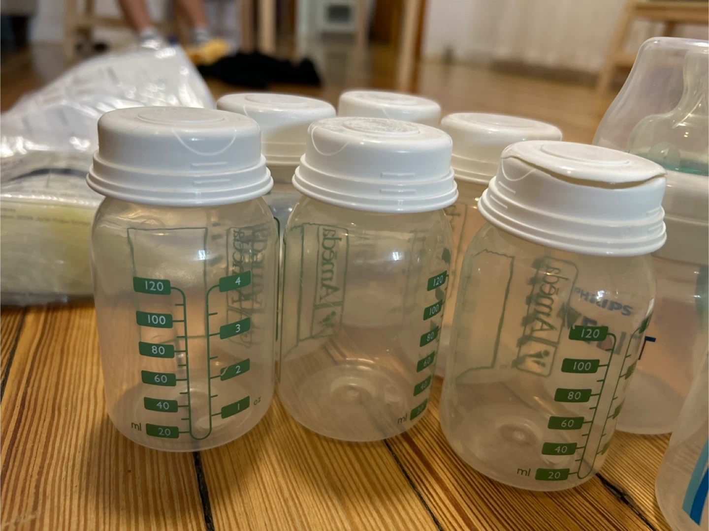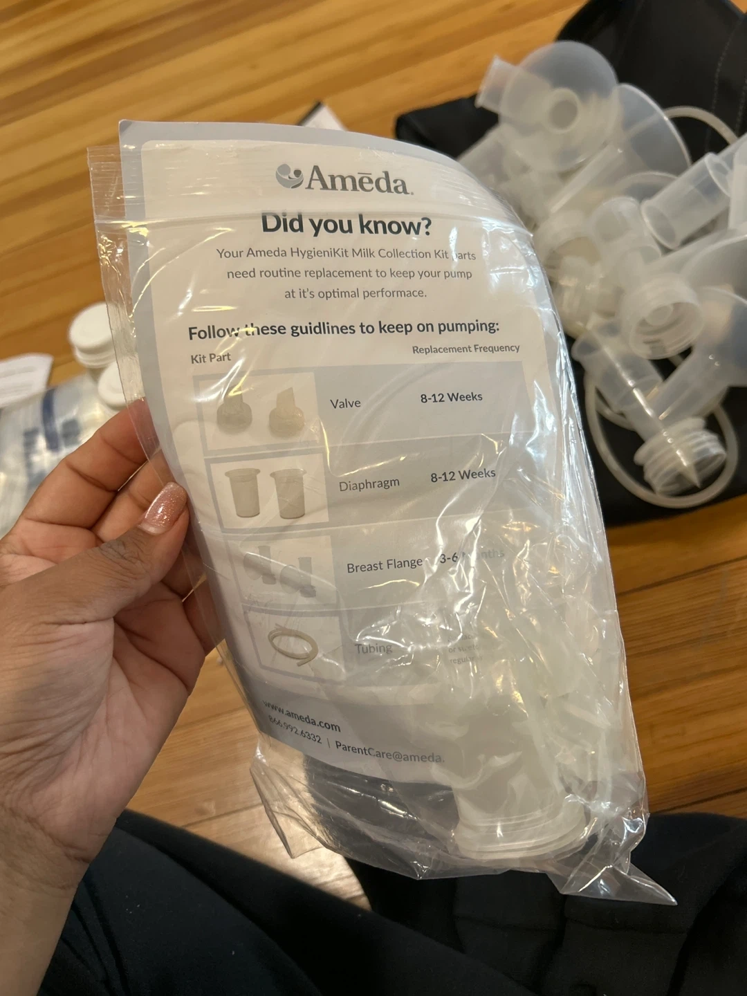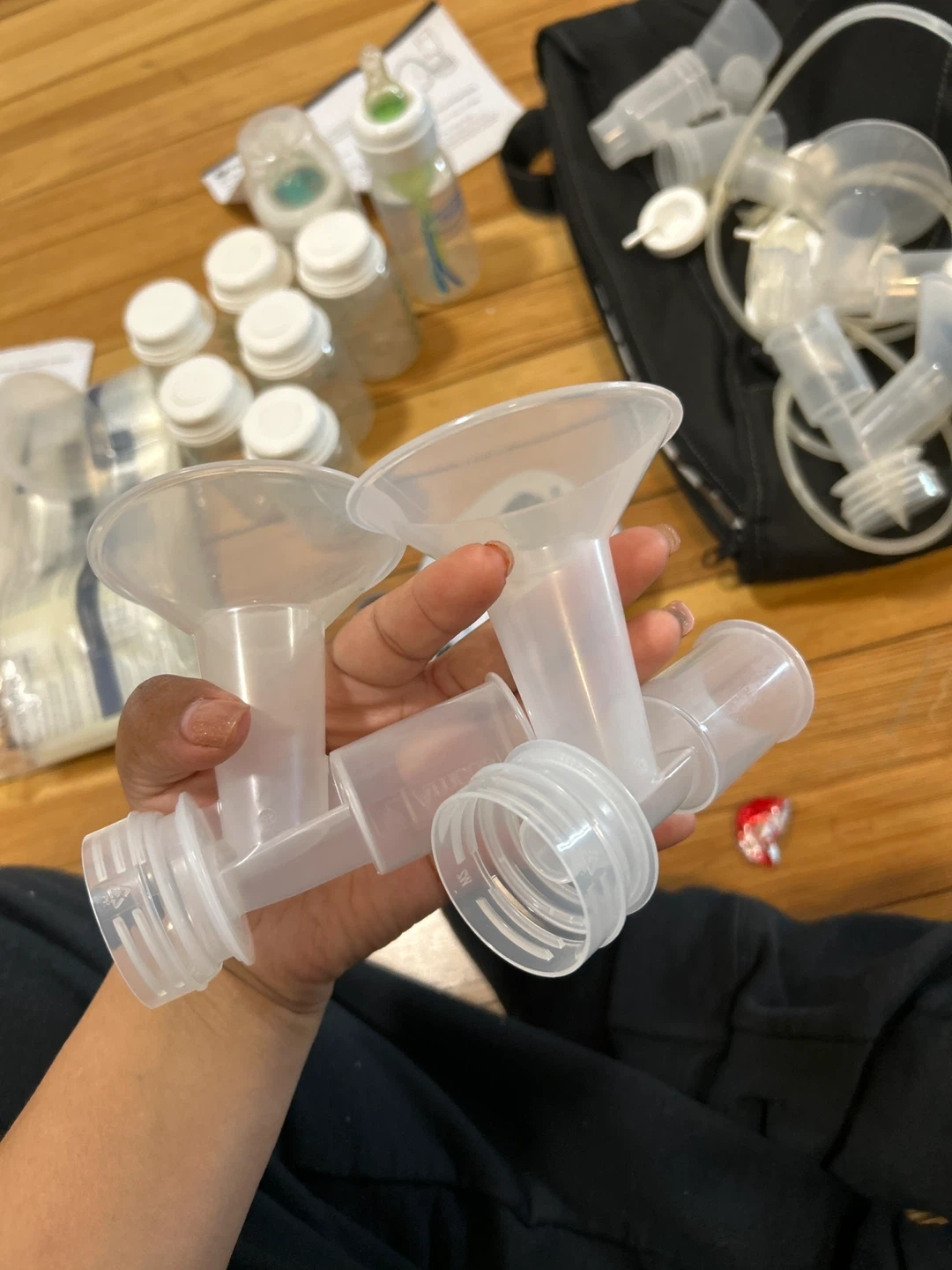 This is an Ameda Mya Joy PLUS double electric breast pump. It includes a black storage bag with various breast pump accessories and several milk collection bottles. The pump has a digital display and adjustable settings. I opened it but it was never used