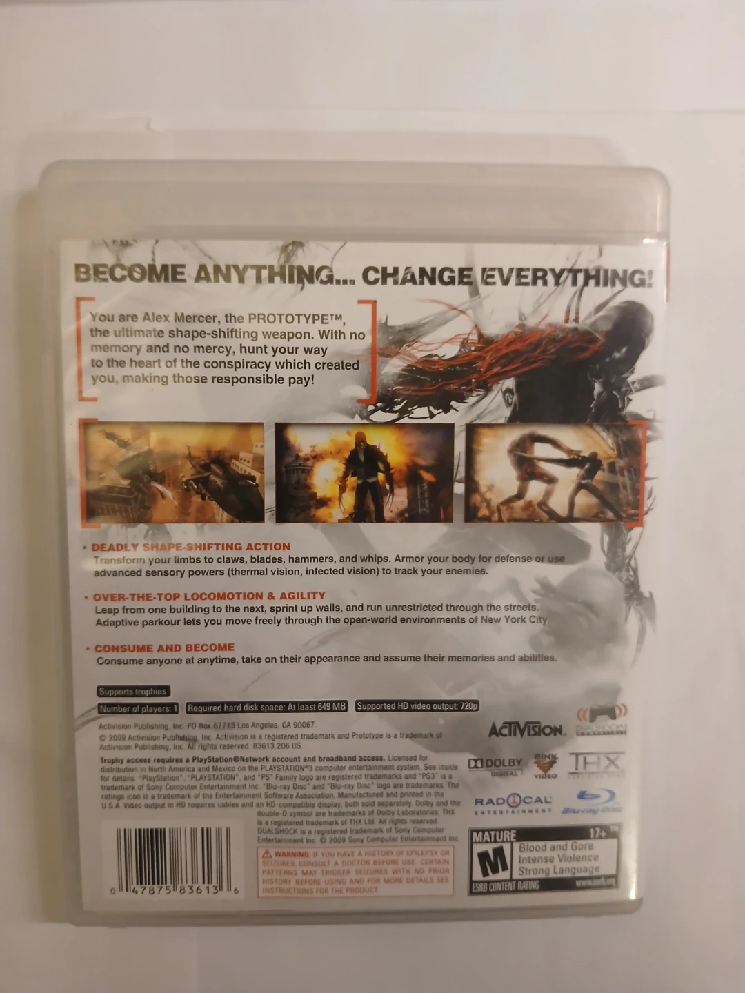 This is the Prototype video game for PlayStation 3. It includes the game disc and case. The game features deadly shape-shifting action and over-the-top locomotion and agility. You can consume anyone and take on their appearance and assume their memories and abilities.