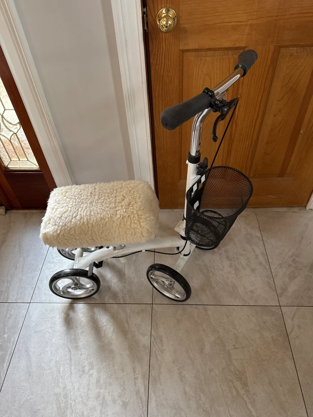 38Here's a knee walker scooter in good condition. It has a comfortable seat with a soft, sheepskin-like cover. It also has a basket on the front for carrying items. Perfect for getting around while recovering from a foot or ankle injury