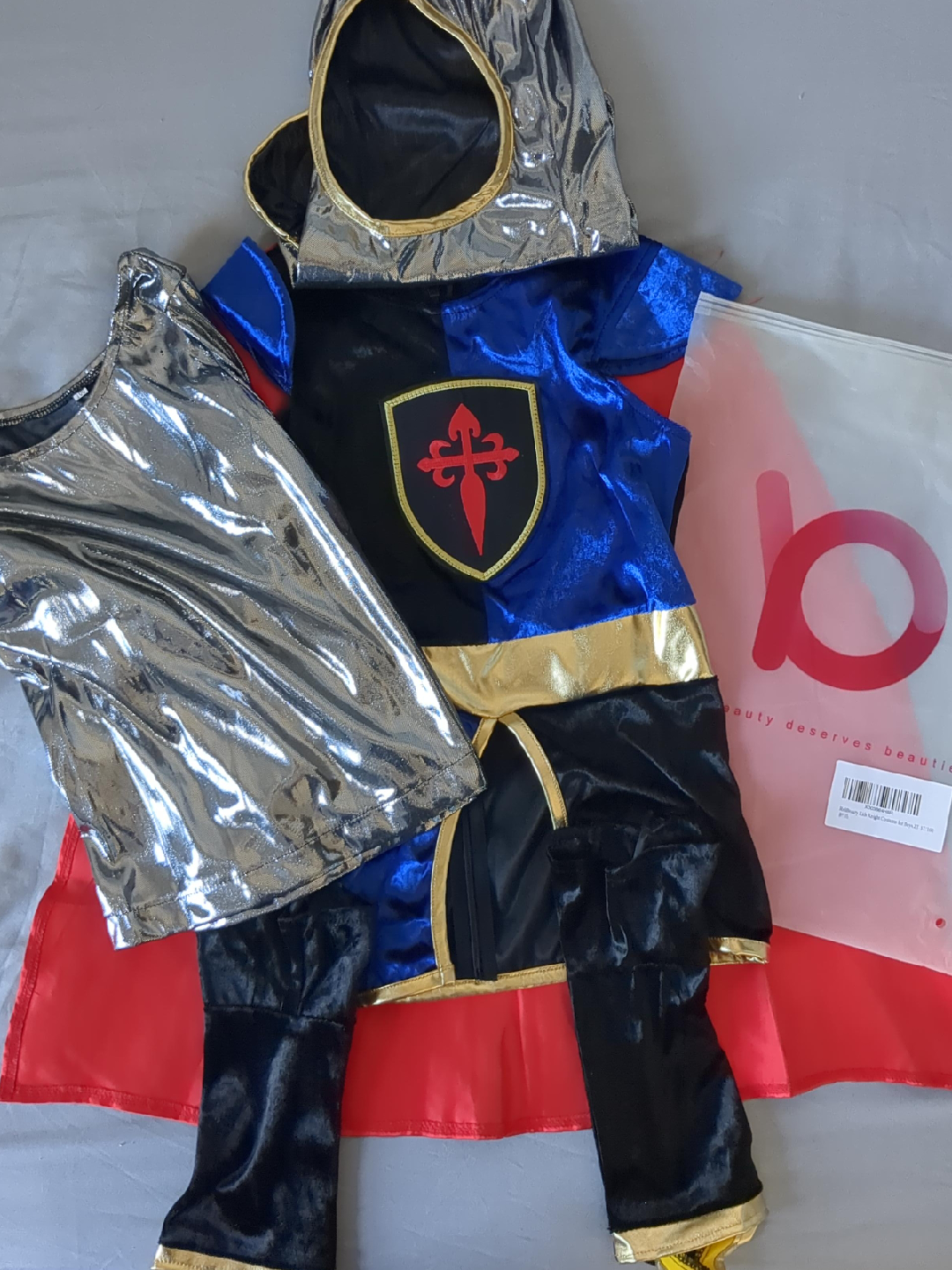 This is a knight costume with a silver top, black and blue tunic with pants, and a red cape. Great for dress-up or Halloween!