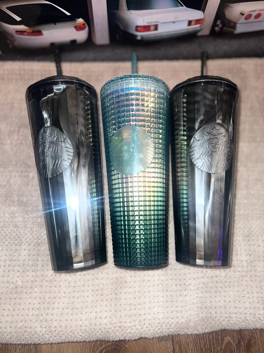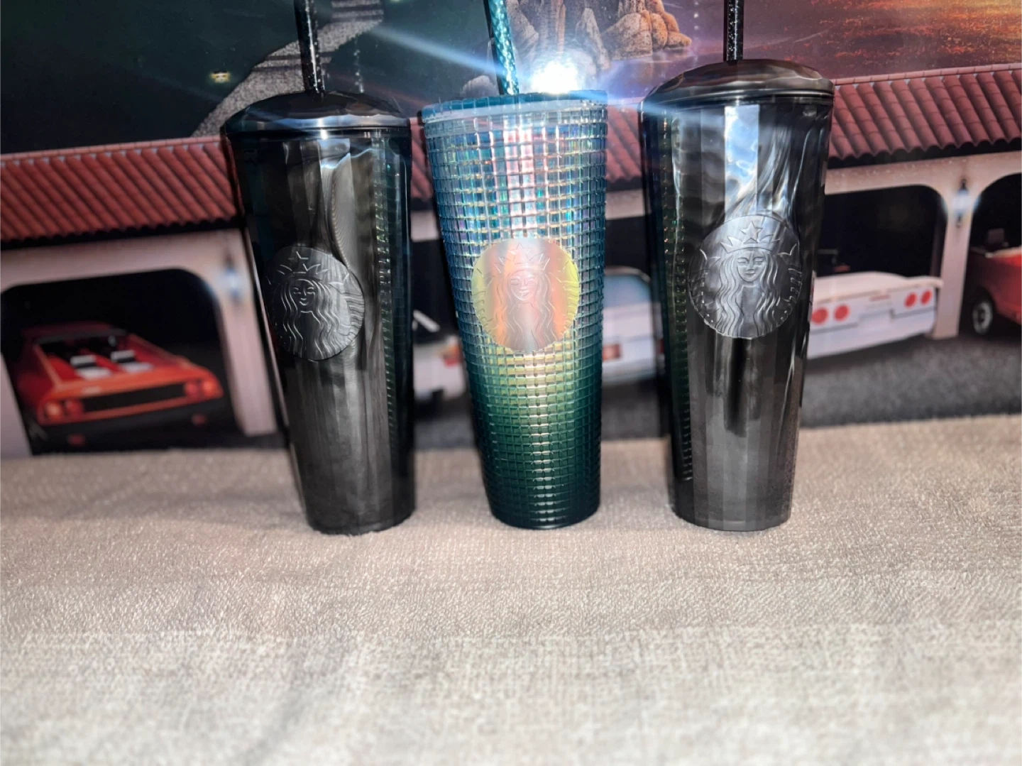 Three Starbucks tumblers with lids and straws. Includes two dark colored tumblers and one iridescent green tumbler. Each tumbler features the Starbucks logo