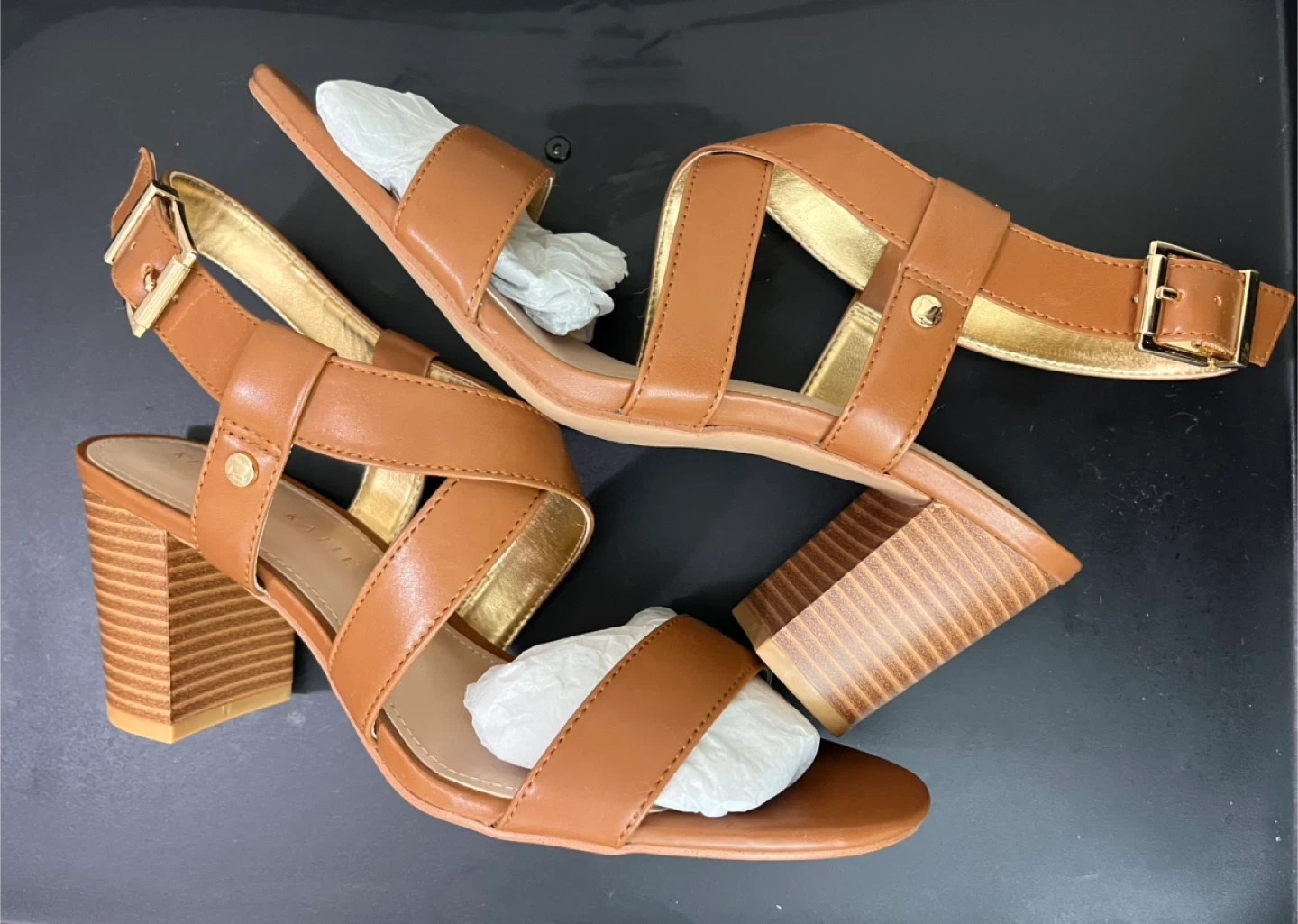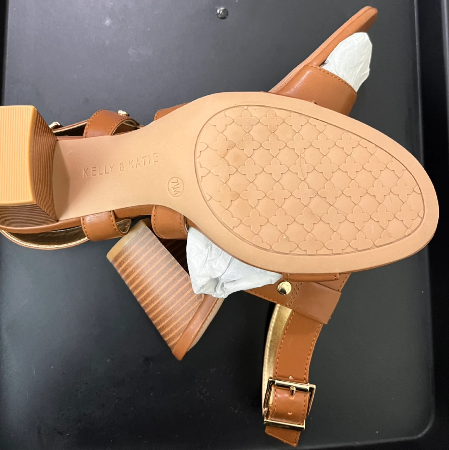 Kelly & Katie women's strappy heeled sandals in a size 7.5 medium width. These sandals feature a brown, finished PU material with a secure buckle closure. They have a comfortable block heel.