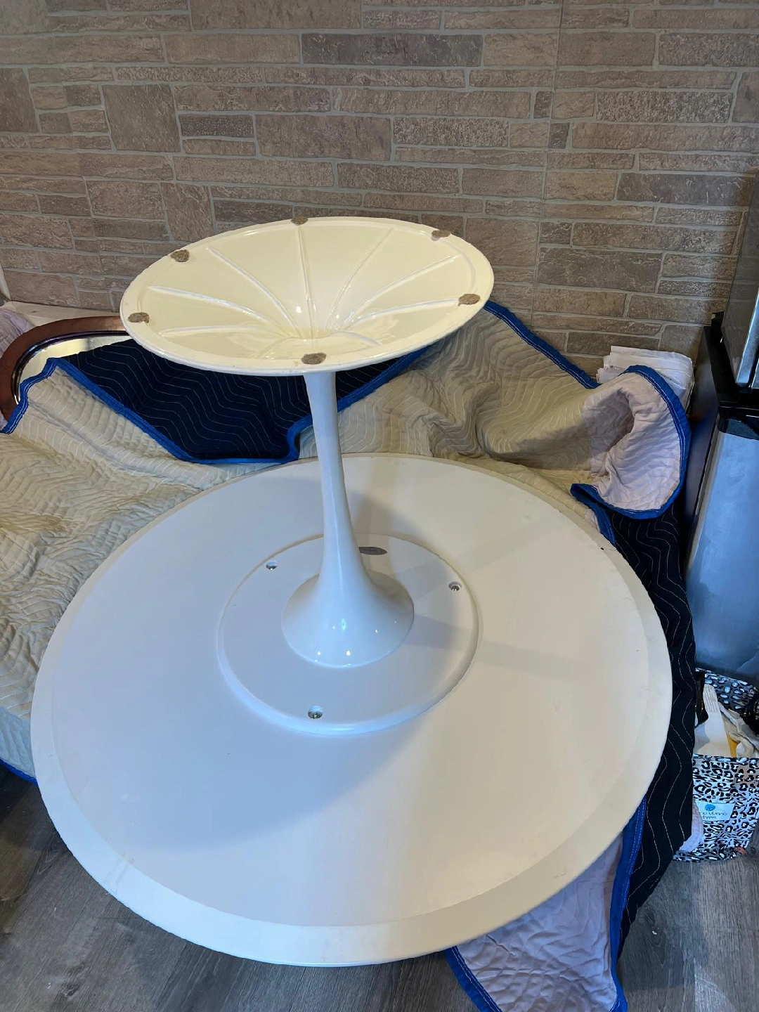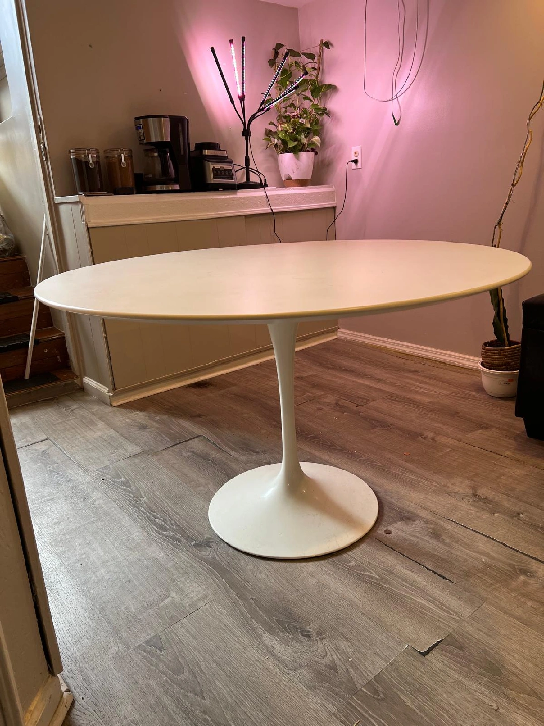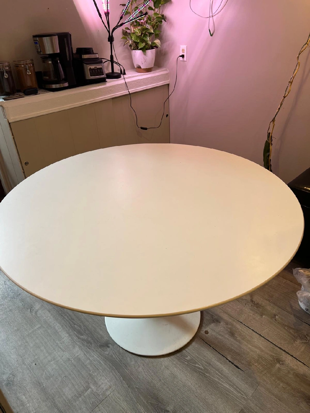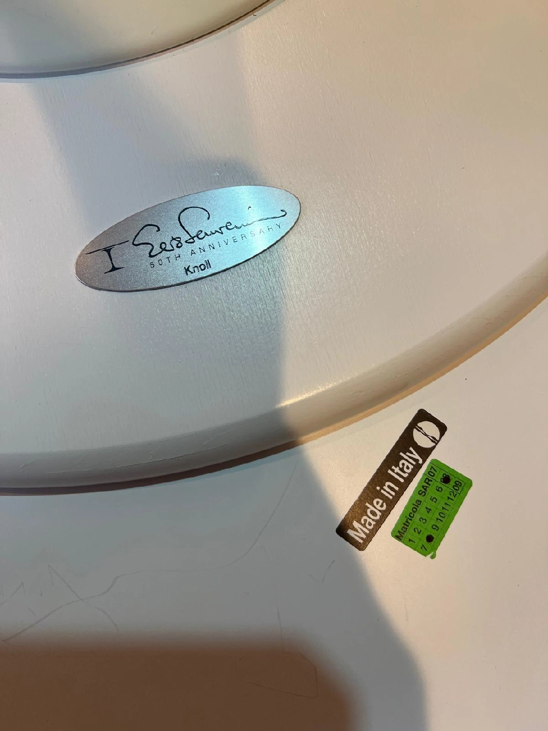 68Selling a beautiful Knoll Saarinen round dining table. It's in excellent shape and would be a stylish addition to any dining room. The table is white (vetro blanco ) and features the iconic tulip base design. A sticker says 'Made in Italy'.